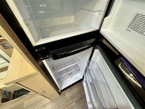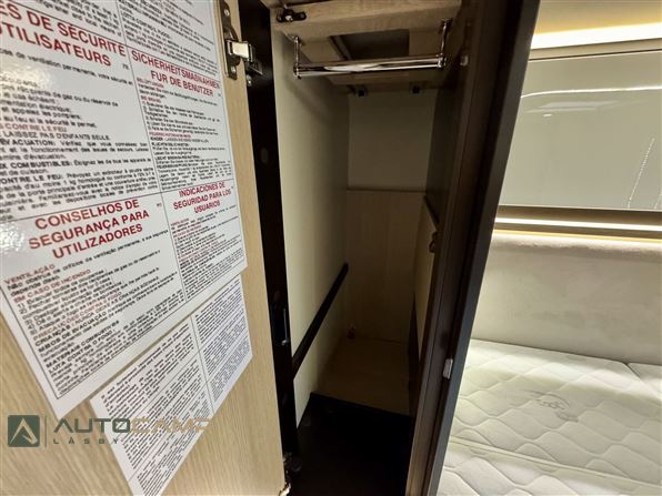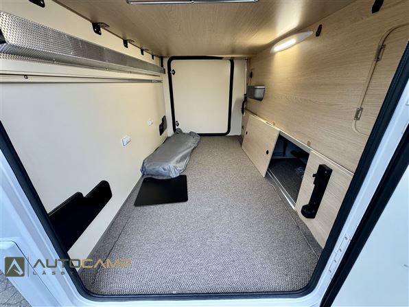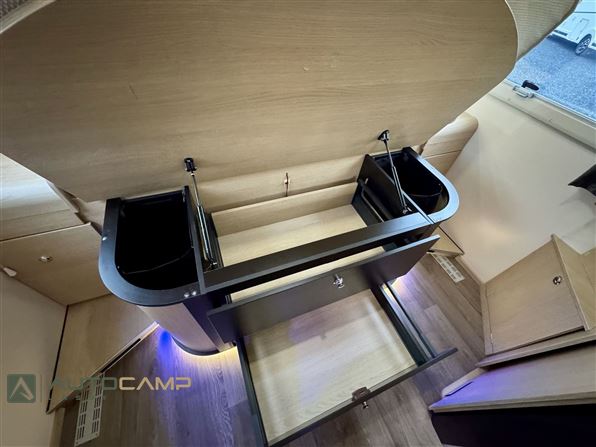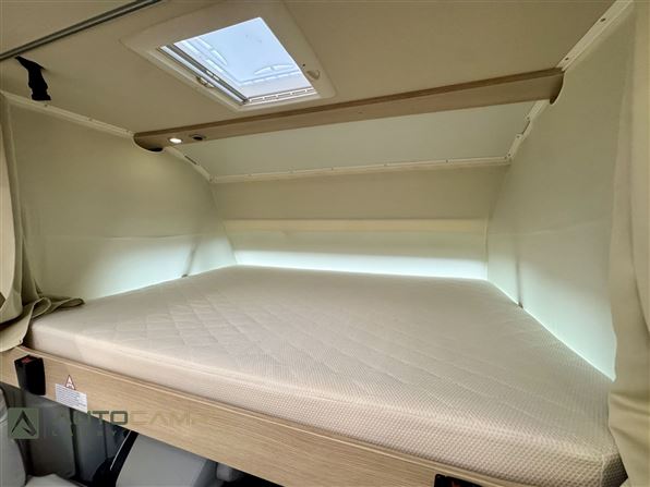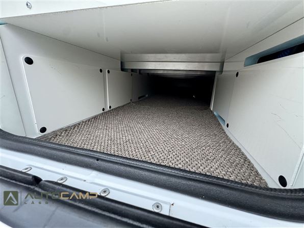 Indretning: Face-Face med drejbare førerstole og sænkbar seng i førerhuset, Stort køkken område med alt tilbehør, badeværelse/toilet i hver sin side af vognen, Queensbed med højskabe i hver side og stort opbevaringsrum herunder. Høj garage.