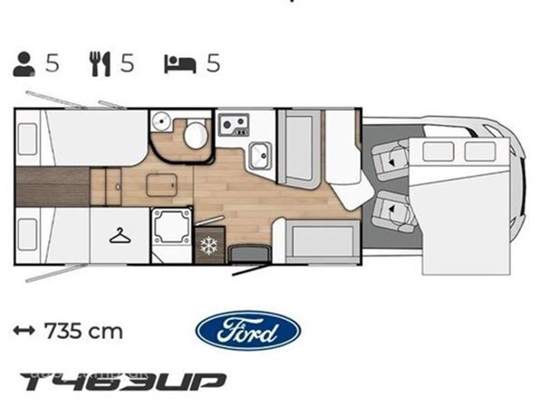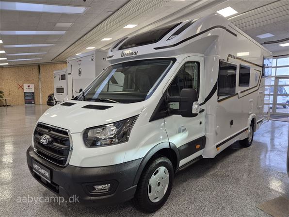 Her får du en Benimar Ready to Travel model dvs. født med meget udstyr fra Fabrikken. Bygget på den nye Ford Transit med Ford´s egen Entertainment system som er i en klasse for sig selv. indrettet med en dejlig rummelig siddegruppe. over den er der en sænkeseng. køkken med to gasblus og stort køleskab med fryser. bad og toilet på hver sin side og bagerst finder man to enkelt senge der kan laves om til en stor seng.