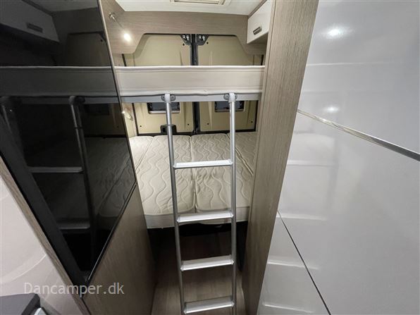 Den korte van med plads til hele familien. 2,2 L, 140 Hk, manuel gear, man. aircondition i førerkabinen. USB-stik, udendørs bordskinne, elektrisk indgangstrin. Tilbehørspakke: Markise, solpanel, plisségardiner i førehus, udvendig belysning v. skydedør, myggenet, mulighed for opredning dinette. Connectpakke: Bakkamera. Ratbetjening samt DAB-radioantenne / -radio. Sengemål i øverste dobbeltseng: 184*133 cm, sengemål i nederste dobbeltseng: 184*133 cm.