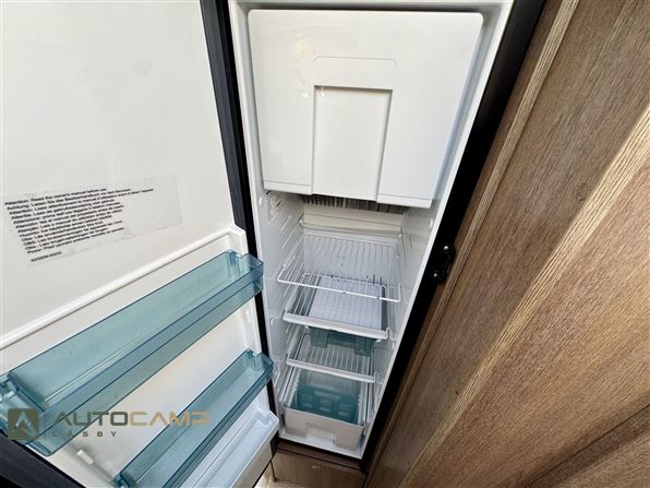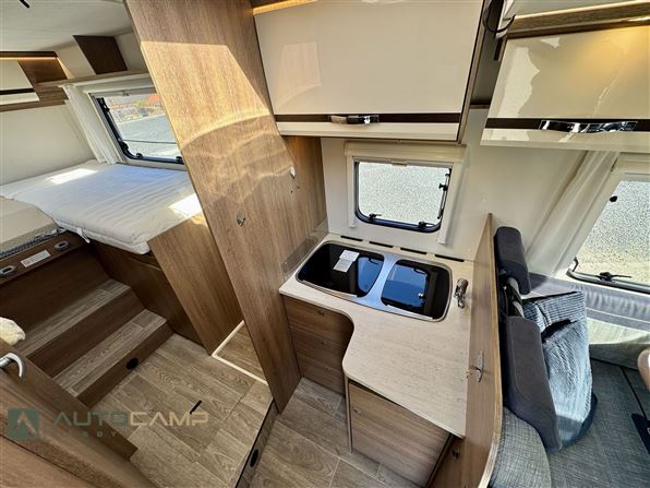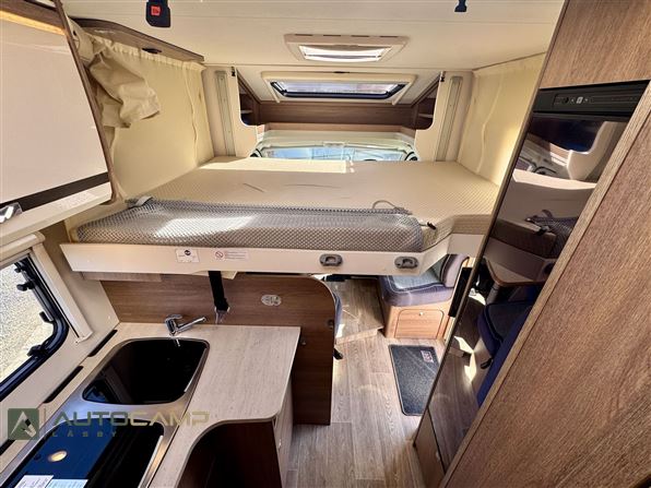 Indretning: Autocamperen byder velkommen i stor l-siddegruppe med drejbare førerstole med hæve/sænkeseng over. Vinkelkøkken med komfur, køl, frys og håndvask, separat toilet og bad med dobbeltfunktion luk bør dør. høje enkeltsenge med stor garage under.