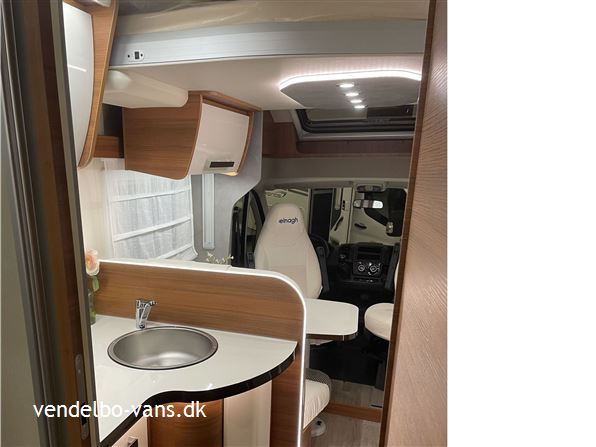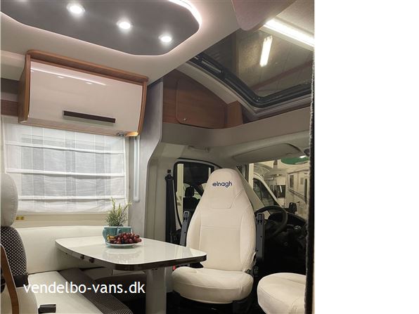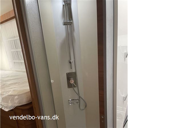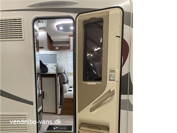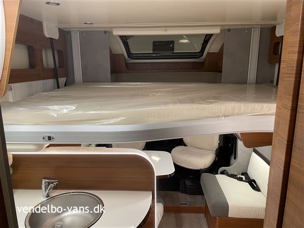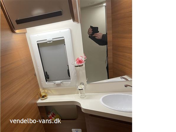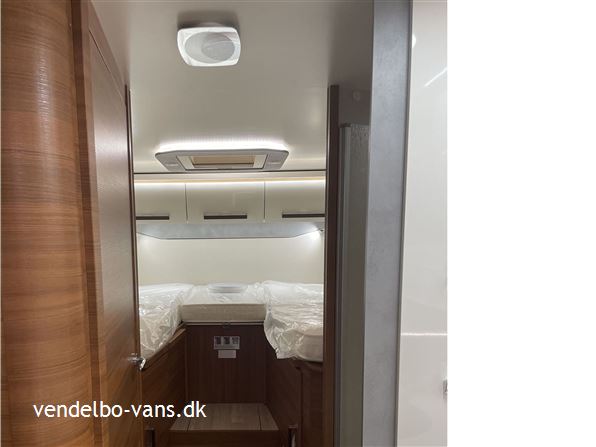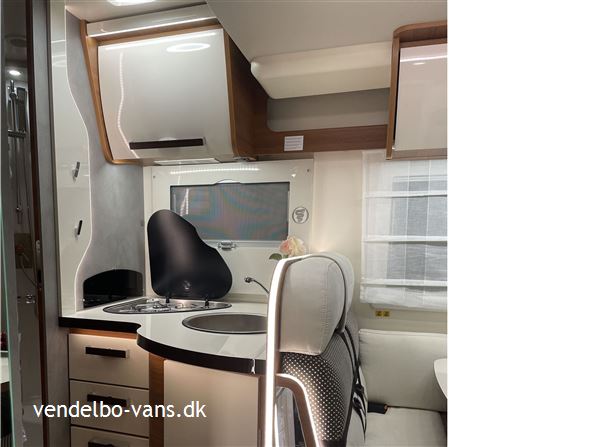 Stor dejlig garage med 2 store døre, enkeltsenge ovenover med mulighed for opredning til stor mega dobbeltseng. Derforuden en el- sænkeseng over dinetten. Toilet og bad er hver for sig i hver sin side af vognen. Vinkelkøkken som giver ekstra bordplads og en L. siddegruppe med plads til hele familien. Denne vogn er købt hjem med følgende udstyr som er indregnet i prisen: Motor 140 HK, Truma C kombivarme, CP+ styring af varmesystem, 12V turbovent tagluge med sug & blæs, 16" alufælge, tågelygter m/kurvelys, kevlar bagfjedre.