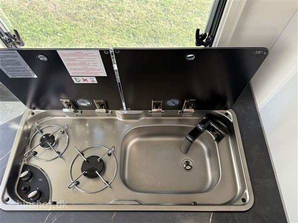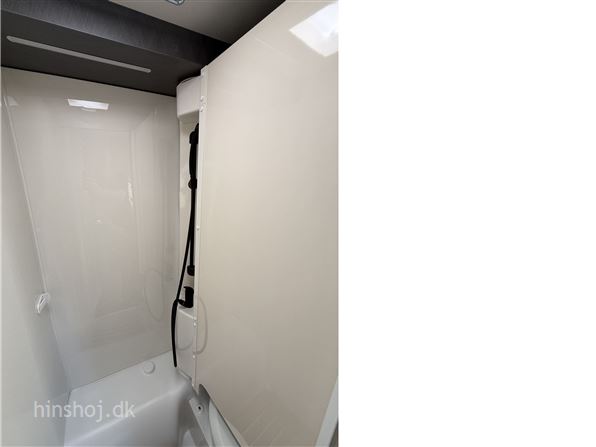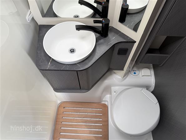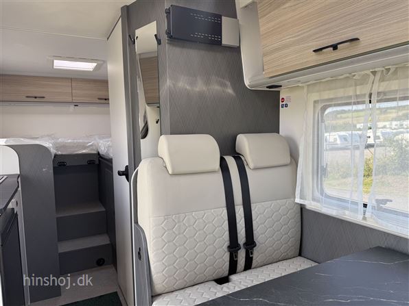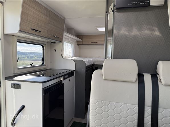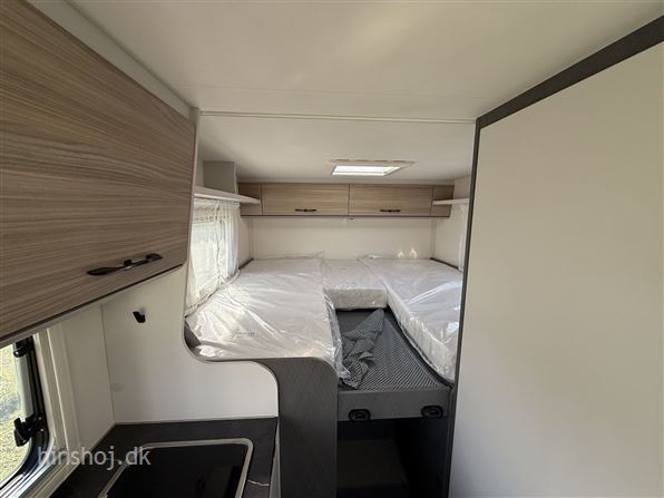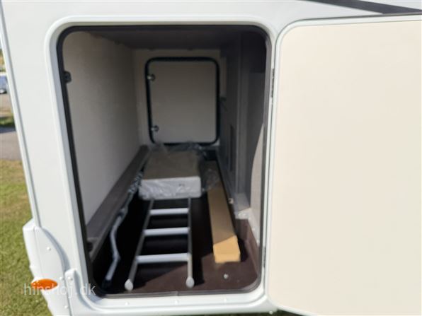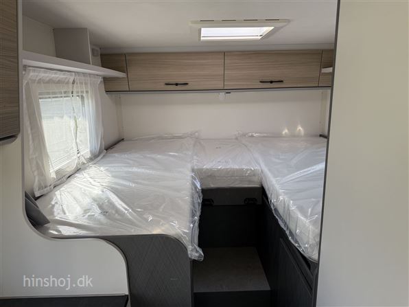 I bagenden finder du et stort og indbydende soveværelse med enkeltsenge og lameludtræk – placeret over en rummelig hækgarage med 2 store døre. Foran venter en hyggelig siddegruppe i Portofino læderlook, et funktionelt køkken med køleskab samt et smart Vario-toiletrum med bruser.