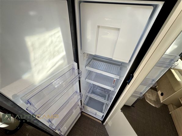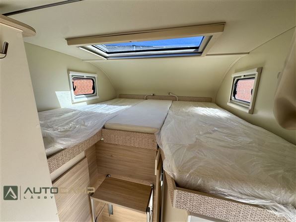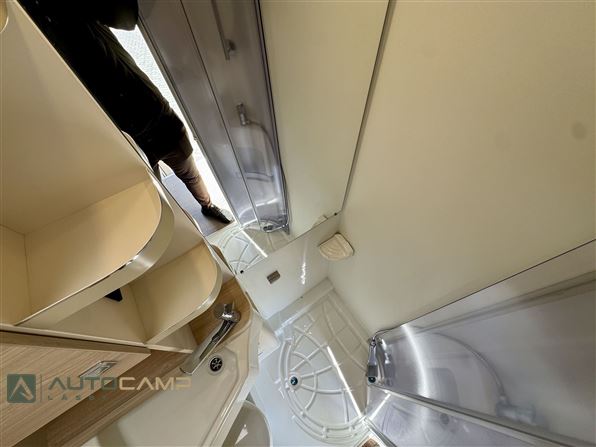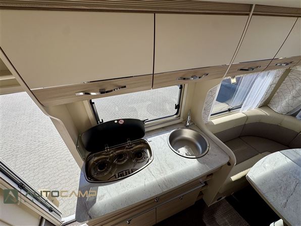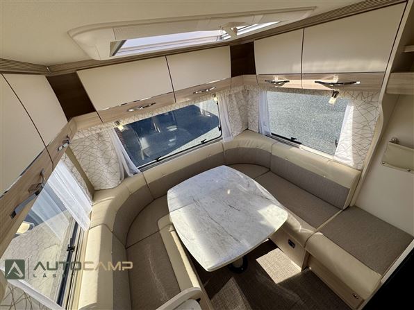 Indretning: Stor rundsiddegruppe i bag, kombineret bad og brus i midten af vognen, Lækkert køkken med højt køle/frys, gasbageovn, gaskomfur, håndvask og masser af skabsplads. stor seng i alkoven.