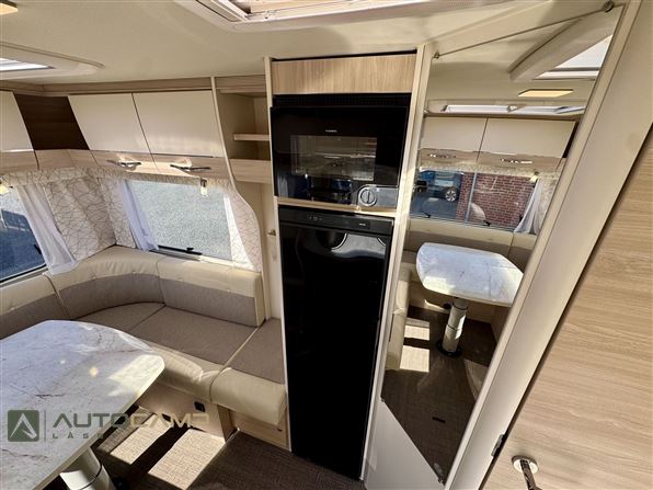 Automatgear 9G, Fiat 2,2 JTD 140HK Truma Combi 6E, Gasbageovn, Panorama "Sun Roof", Markise, Solcelleanlæg, DAB antenne, førerhusmåtte, indfarvet forkofanger, plissé i førerhus, myggenetdør, 16" alufælge, frontgrill i højglans sort, kromdetaljer på front, tågelys med kurvelys, Automatisk klimaanlæg, ratbetjening, læderrat og -gearknop, Multimedie med bakkamera.