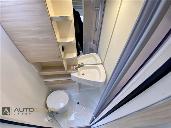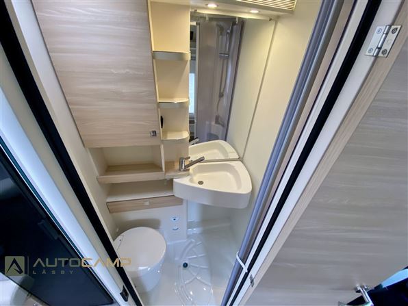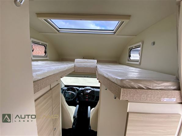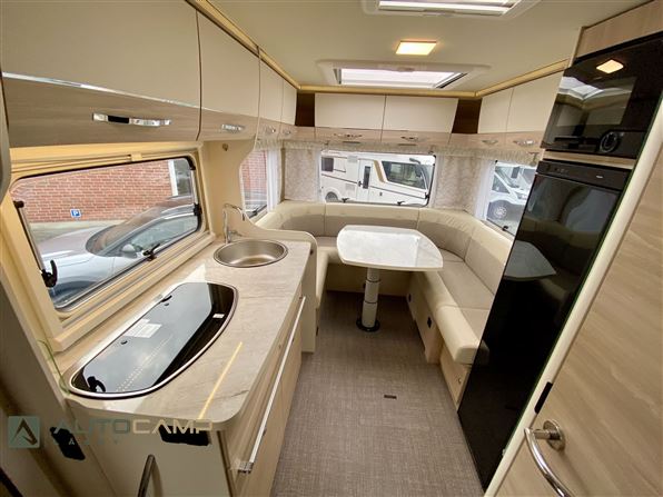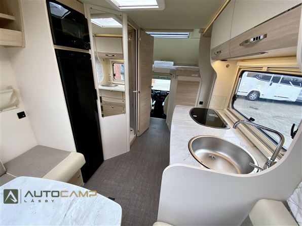 Indretning: Stor rundsiddegruppe i bag, kombineret bad og brus i midten af vognen, Lækkert køkken med højt køle/frys, gasbageovn, gaskomfur, håndvask og masser af skabsplads. stor seng i alkoven.