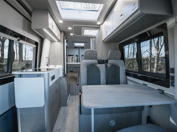 Bagtil har den en elektrisk dropdown-seng (133x196cm) som kører langt ned. Når sengen er oppe kan man bruge den ekstra plads til opbevare cykler indenfor. Samtidig kommer den med et smart bord og stole system, som kan opbevares i skydedøren og bagdørene lidt på samme måde som en VW california. Samtidig kommer den med et smart bord og stole system, som kan opbevares i skydedøren og bagdørene lidt på samme måde som en VW california