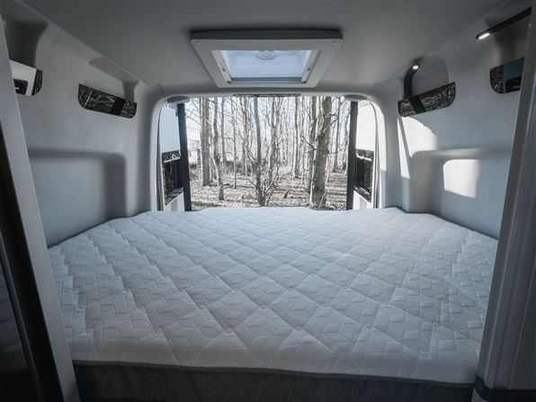 Bagtil har den en elektrisk dropdown-seng (133x196cm) som kører langt ned. Når sengen er oppe kan man bruge den ekstra plads til opbevare cykler indenfor. Samtidig kommer den med et smart bord og stole system, som kan opbevares i skydedøren og bagdørene lidt på samme måde som en VW california. Samtidig kommer den med et smart bord og stole system, som kan opbevares i skydedøren og bagdørene lidt på samme måde som en VW california