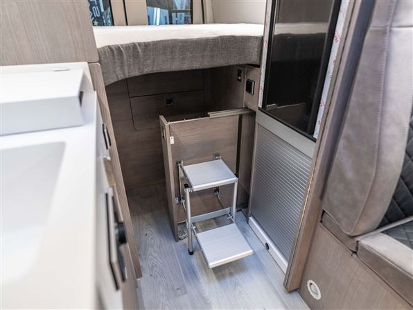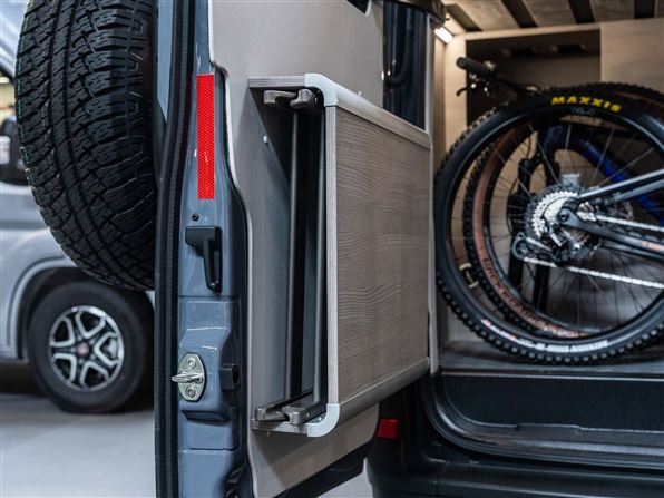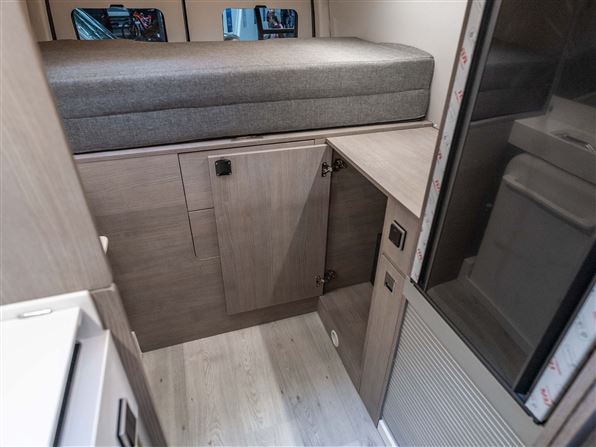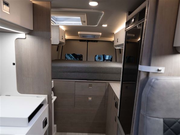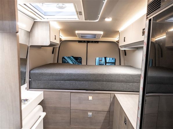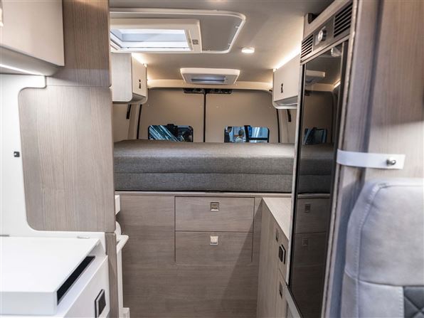 Bagtil har den en rummelig soveafdeling med langsgående senge (170 x 196 cm), læselamper og overskabe. Under sengene findes en garage med plads til to cykler samt stik til opladning af el-cykler og der er integreret udendørsbord i skydedøren og to foldestole gemt i bagdørene.