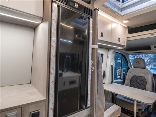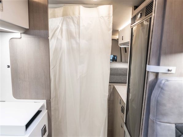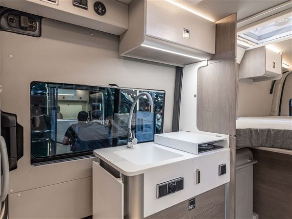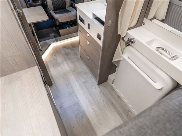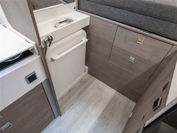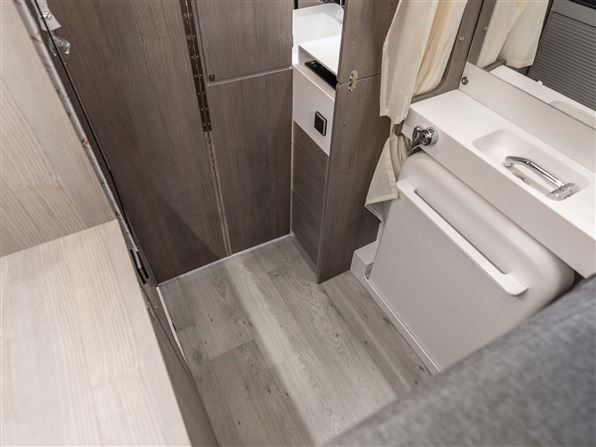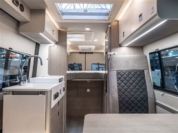 Indvendigt byder den på et topkvalitets køkken i Corian, fuldt udtrækkelige soft-close skuffer og mulighed for induktionskogeplade, og et stort 110-liters 12V kompressor-køleskab. Det patenterede badeværelse imponerer med en fuld brusekabine, brusebund i corian, antibakterielt bruseforhæng, elektrisk Clesana® toilet og en kraftig Maxfann tagventilator.
