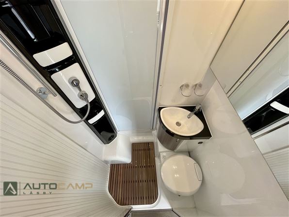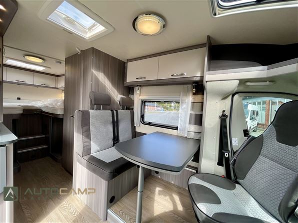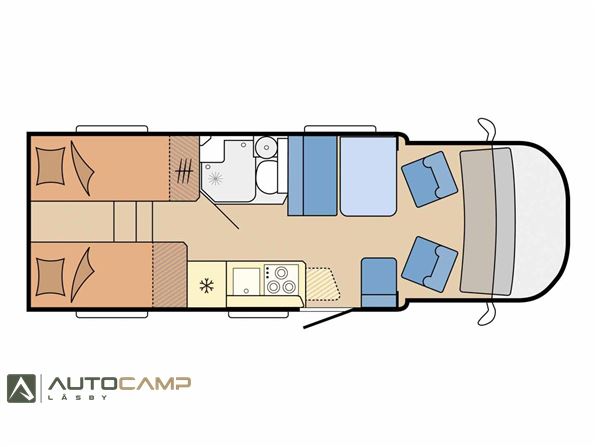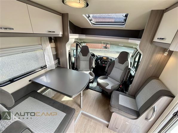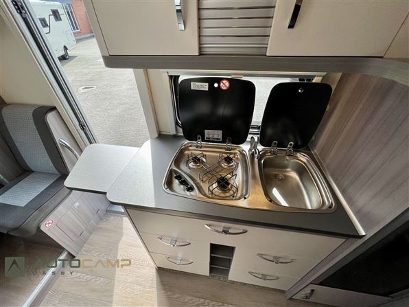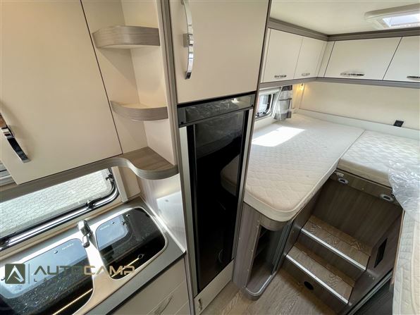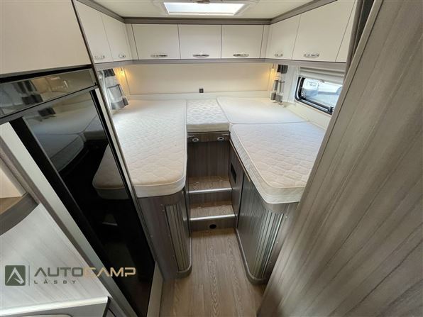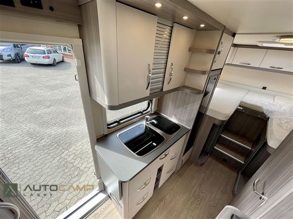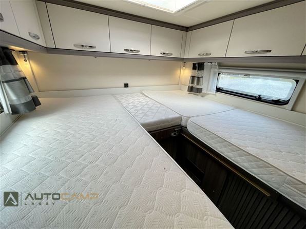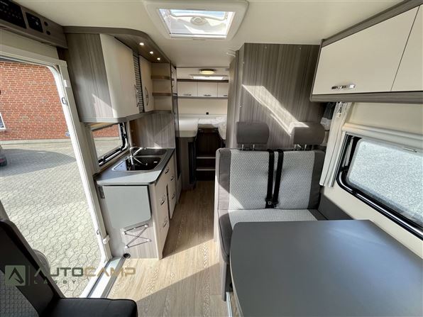 Godt indrette camper fra Tyske Hobby, som trods størrelsen har masser af plads. Bagerest er de høje enkeltsenge med garage under. I modten finder man køkken med masser opbevaring og stort køleskab - overfor kombineret toilet/bad. Forrest er siddegruppe med godt lys og stort bord.