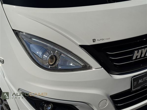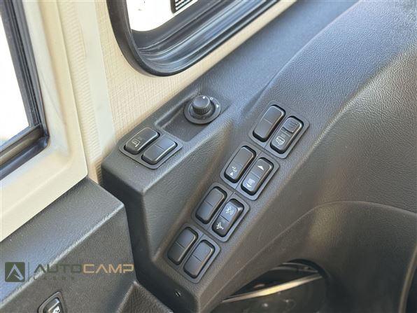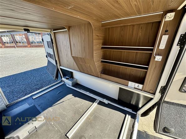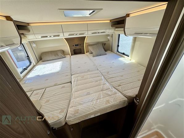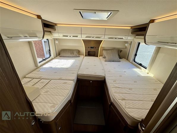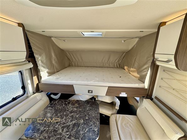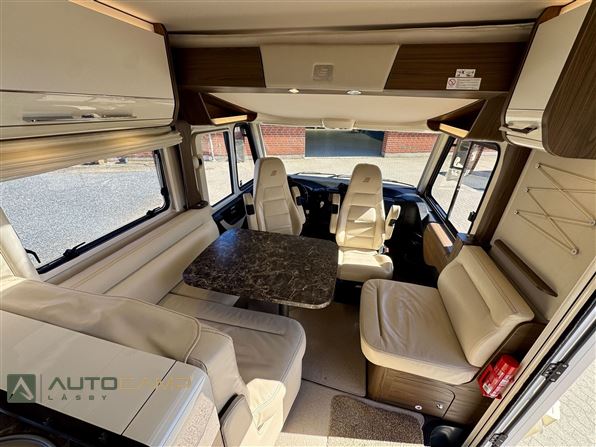Indretning: i front 2-drejbare førerstole med hæve/sænkeseng over, Stor L-siddegruppe, køkken i venstre side af vognen, køl/frys/ovn på modsatte side, separat toilet og badeværelse i midten, høje enkeltsenge i bag med stor garage under.