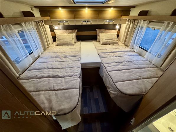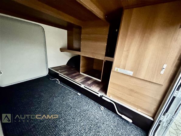 Her får man en lille men yderst veludnyttet vogn fra Tyske Knaus. Med en længde på kun 6,79m og bredde på 2,2m er den nem at komme rundt med og kører rigtig godt. Vognen er med enkeltsenge og kæmpe garage i bag, hvor man efterfølgende har det geniale badeværelse og klædeskab overfor. Forrest er siddegruppe og køkken placeret.