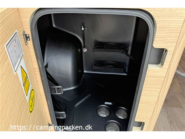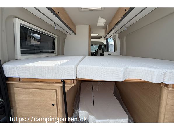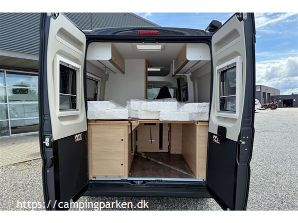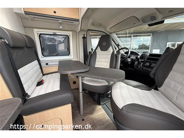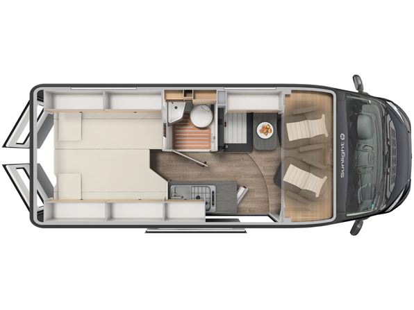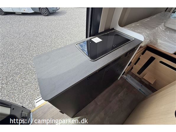 Sunlight Cliff campervan på kun 5,99 meter i flot sort metallic med enkeltsenge, opredning i siddegruppen og meget udstyr, bl.a. automatgear, full LED-forlygter, Truma Combi 6 E varme m/elpatron, isoleret og opvarmet spildevandstank, Chassis pakke (elektrisk p-bremse, elektrisk opvarmede og klapbare sidespejle, 90 l dieseltank, kompressorkøleskab, rammevinduer, markise, plisségardiner i førerhus m.m.