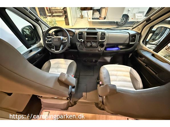 Sunlight Van V60 Adventure, med dobbeltseng i bag og siddegruppe med plads til 4 personer. Kompakt autocamper under 6 meter, smal model kun 214 cm i bredden. Veludstyret vogn med bl.a. automatgear, adaptiv fartpilot, Combi 6E fyr, el-gulvvarme, opredning i siddegruppen, plissé i førerhus.