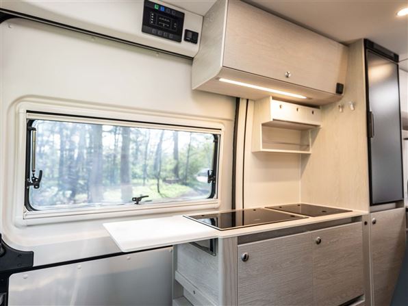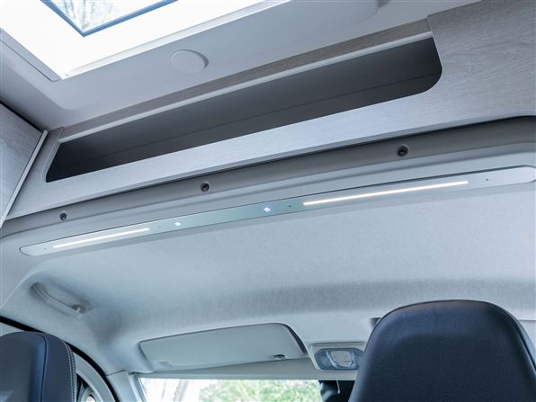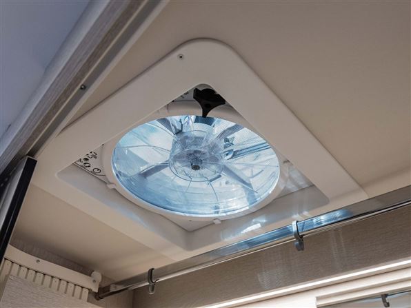 MAXXFAN Deluxe tagventilator, automatisk klimaanlæg, Dometic Raintec RT100 udendørslys med fjernbetjening, udendørs bruser med blandingsbatteri, gasudtag, lysbar over førerhus