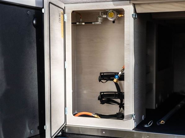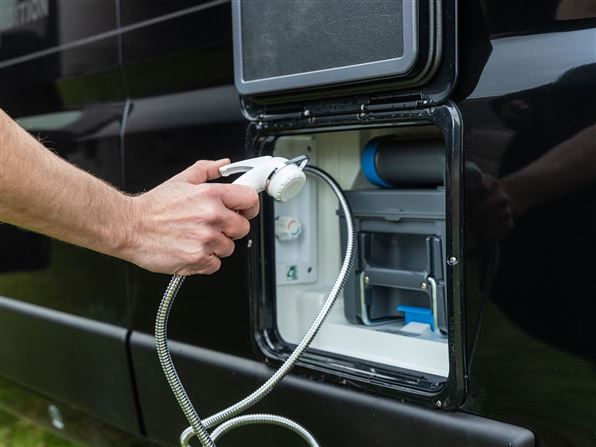 MAXXFAN Deluxe tagventilator, Dometic Raintec RT100 LED-lys med regnbeskyttelse og lysdæmper, udendørs bruser med blandingsbatteri, gasudtag, lysbar over førerhus