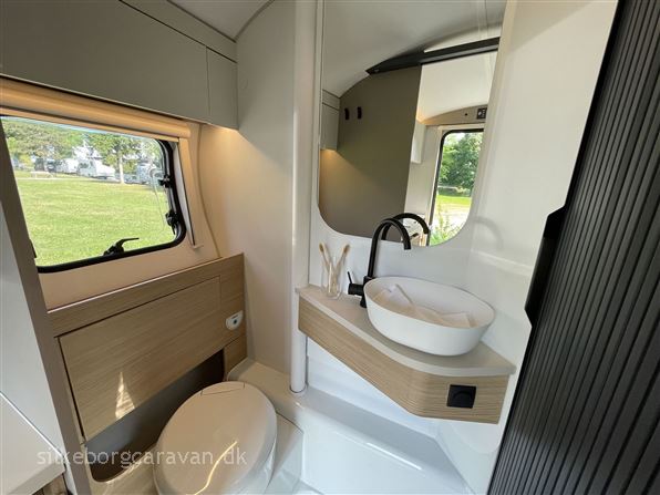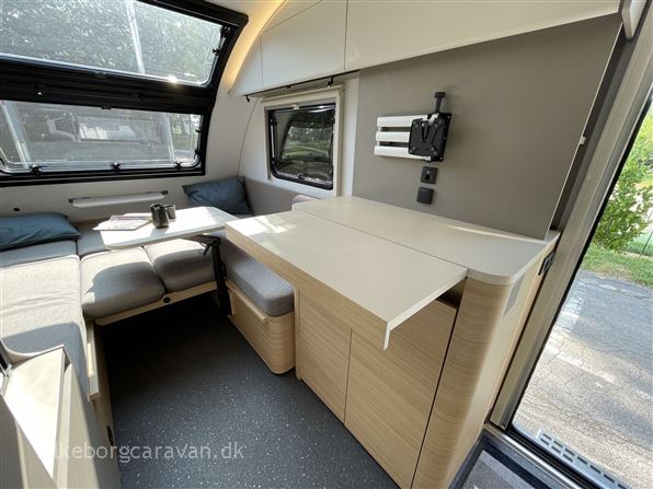 Inde finder du nyt praktisk slide-out bord ved kommoden. Badeværelset er helt nytænkt nu med svingbar væg der forvandler rummet fra bruserum til toiletrum. Køkkenet har fået ny form og ekstra opbevaringsplads, og mangler du bordplads kan kommoden udvides via et smart slide-out bord-system. Skylight vinduerne har fået vokseværk og de øvrige vinduer er "flat-panel" vinduer som visuelt går helt i ét med karosseriet. 391 LH indretningen er videreudviklet med fleksibelt svingbart "lagoon-bord" der giver mulighed for ny smart opredning. Nu med 3 forskellige oprednings-muligheder: 1) enkeltsenge, 2) XL dobbeltseng, 3) Kombi-opredning m/seng & siddeplads. Opbevaringsløsningerne er trimmet og tilgangen er forbedret.
