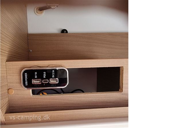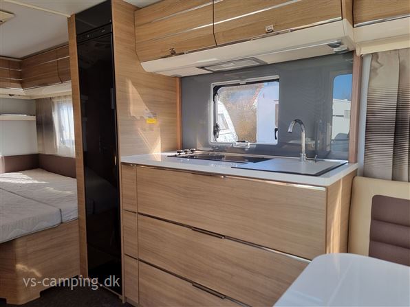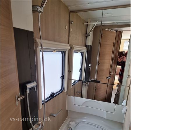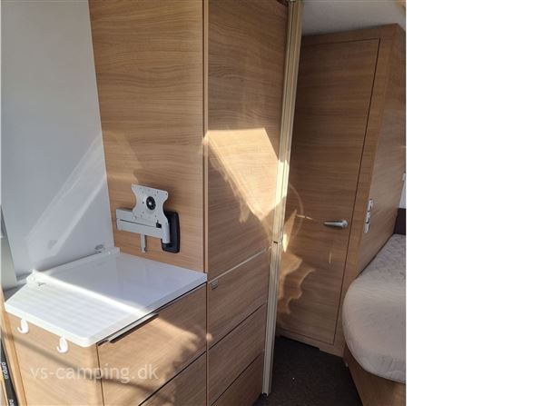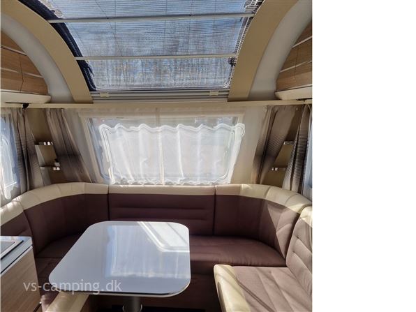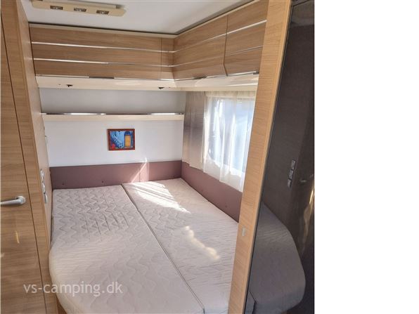 Vognen er indrettet med fransk seng og rundsiddegruppe.
