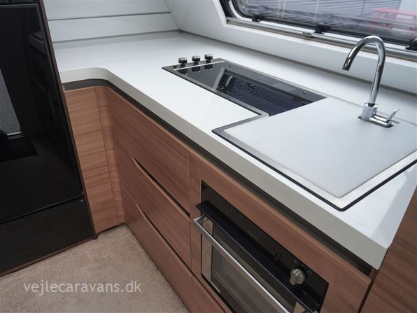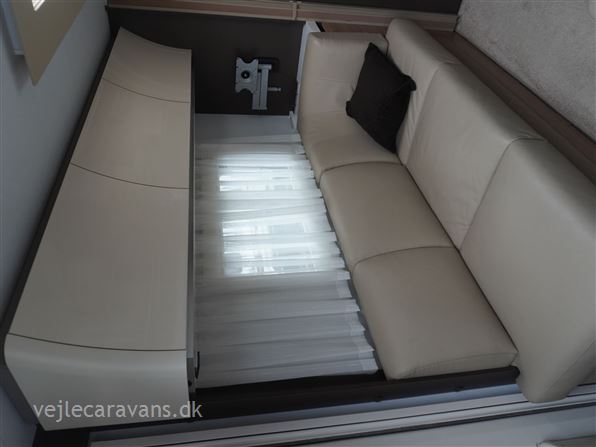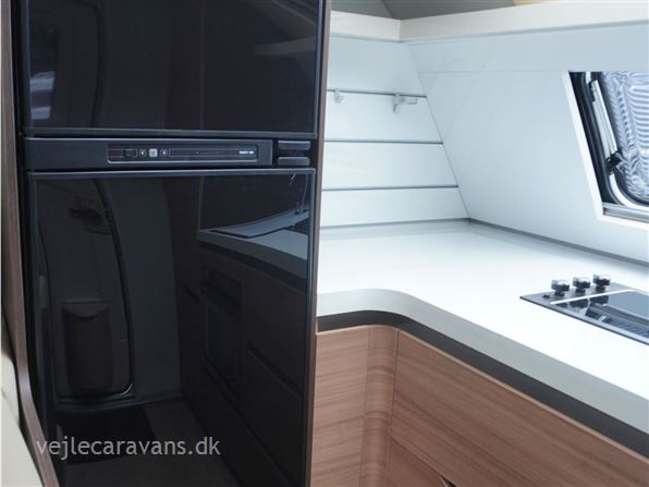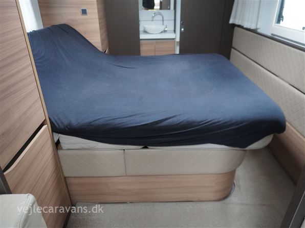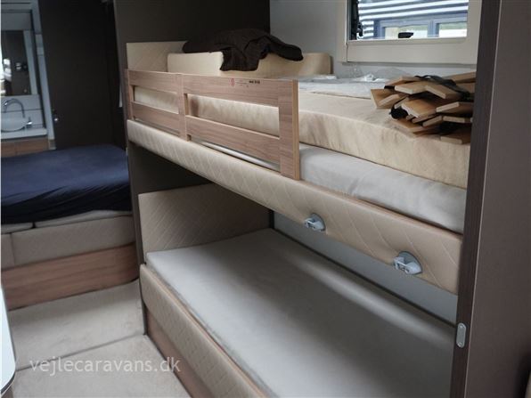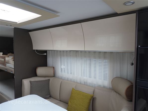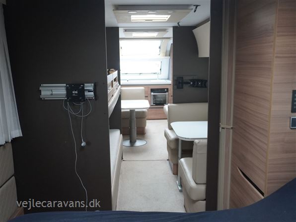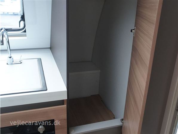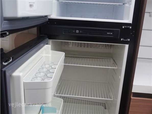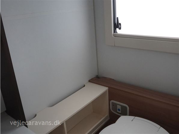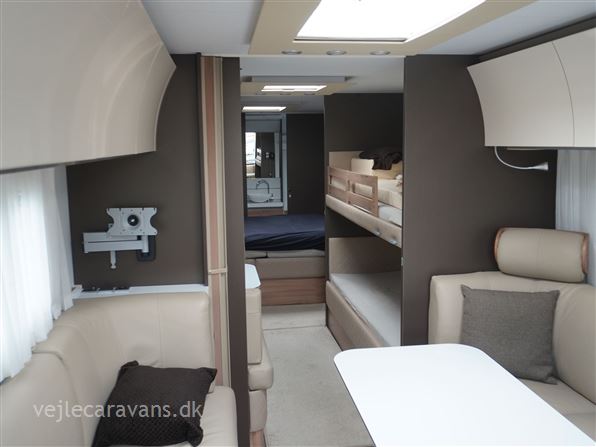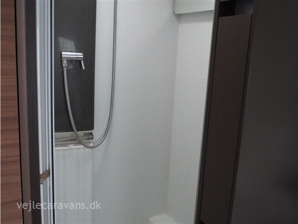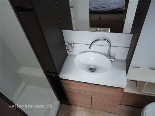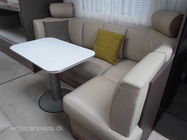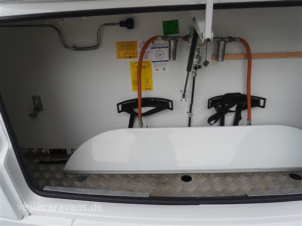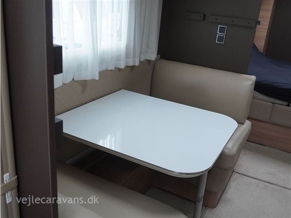 Et sommerhus på hjul med vinkelkøkken i front med 3 gasblus, gasbageovn, og et køleskab på 164 ltr. Fritstående seng ud fra siden. Bagerste i vognen er der toilet på tværs med bruser i højre side, og toilet i venstre side. Midt i vognen er der rundsiddegruppe, og en ekstra siddeplads overfor. Mellem siddegruppe og sengen er der 2 køjer i venstre side, og en siddegruppe med en klapkøje over. Der er monteret Truma duocontrol og byvand på vognen. Prisen er inkl. leveringsomkostninger og nr. plade. Der medfølger ikke nogen fortelt.