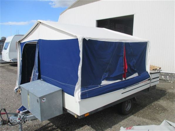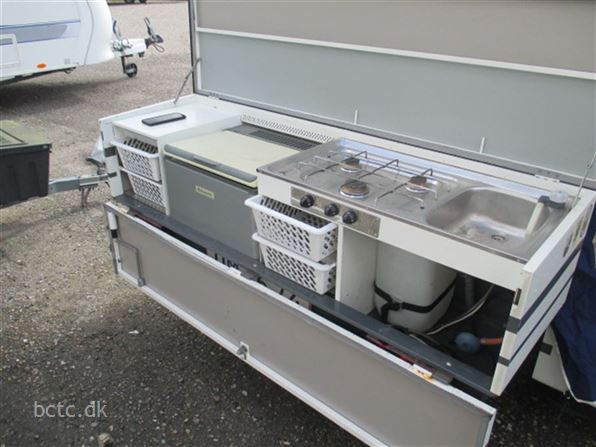 Rigtig flot og velholdt teltvogn med stor køkkenkasse med komfur og køleskab samt smart opbevaringssystem. Der medfølger fortelt, frontbox og kørekappe.
