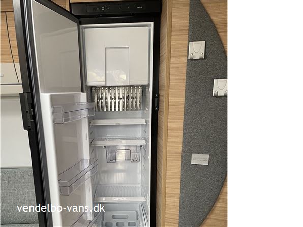 En vel disponeret løsning med rundsiddegruppe bagerst og enkelte senge forrest i vognen, stort dejligt køleskab fra gulv til loft overfor det dejlige store køkken. Lækkert badeværelse med god plads også til et evt. bad. Vognen har monteret mover og fortelt.