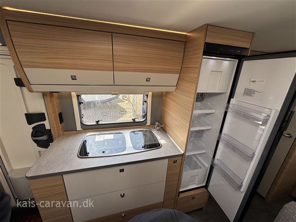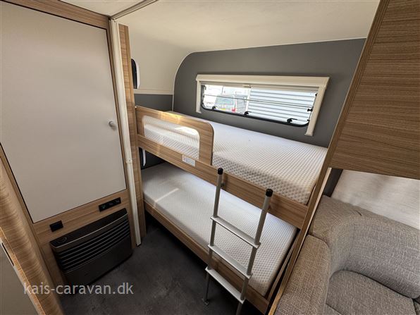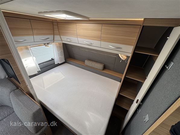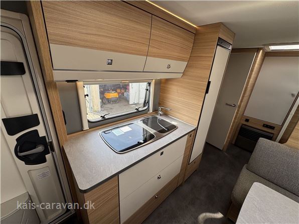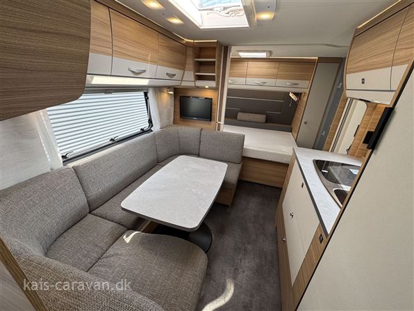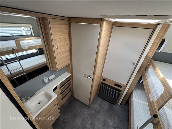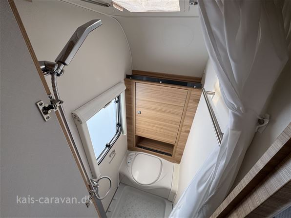 Rigtig pæn køjevogn med masser af plads, 2 køjer og Toilet rum med brus og håndvask uden for toiletrummet i bagenden af vognen, midt i vognen stor rundsiddegruppe og køkken med skuffer og stort slimline køleskab. Forrest i vognen stor dobbeltseng og hyldeskab. Vognen er udstyret med tagmarkise med 1 side. prisen er incl leveringsomkostninger