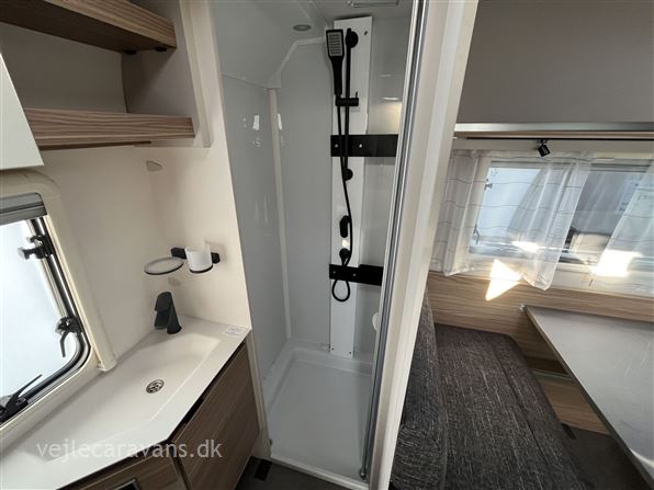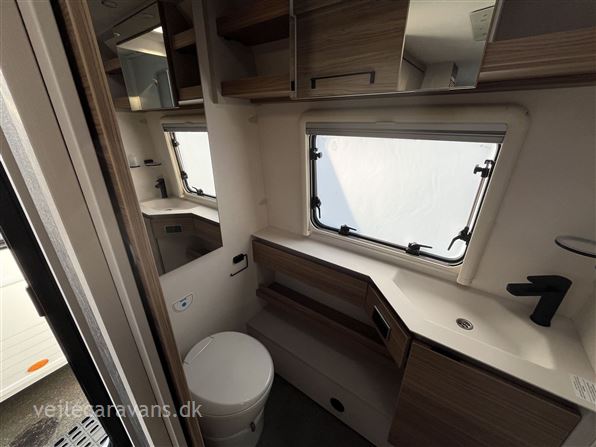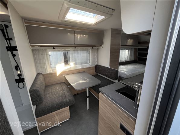 Denne skønne vogn er indrettet med enkeltsenge i forenden, efterfulgt af klædeskab, siddegruppe og køkken med stort køleskab. I bagenden er der badeværelse med separat brusekabine. Prisen er inkl. leveringsomk. og nummerplade.