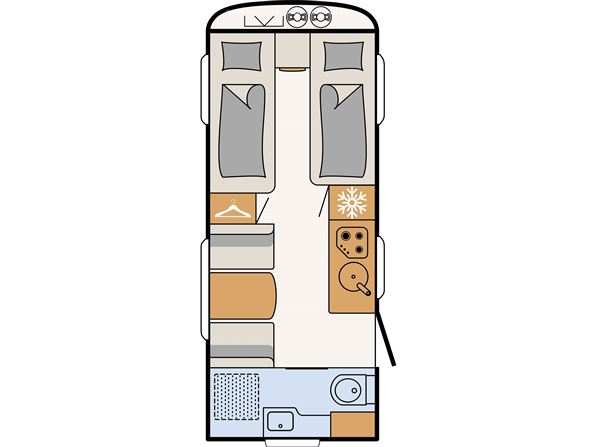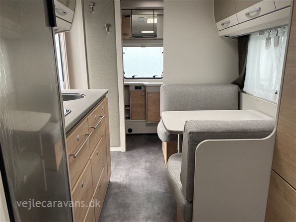 Denne skønne vogn er indrettet med enkeltsenge i forenden, efterfulgt af klædeskab, siddegruppe pg køkken med stort køleskab. I bagenden er der badeværelse med separat brusekabine. Vognen er ekstraudstyret med sengeudvidelse. Prisen er inkl. leveringsomk. og nummerplade.