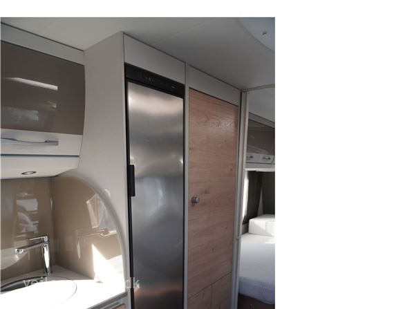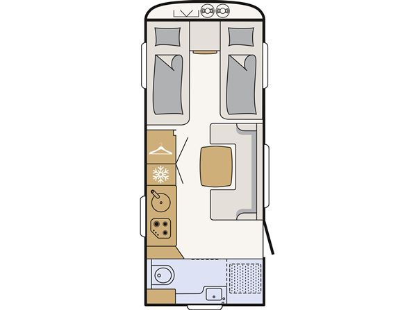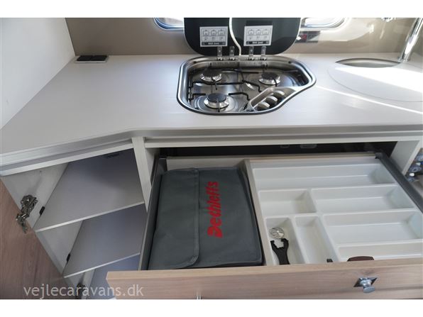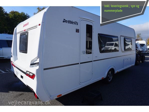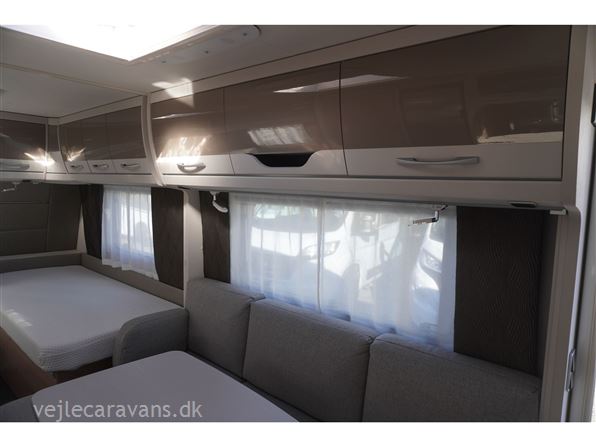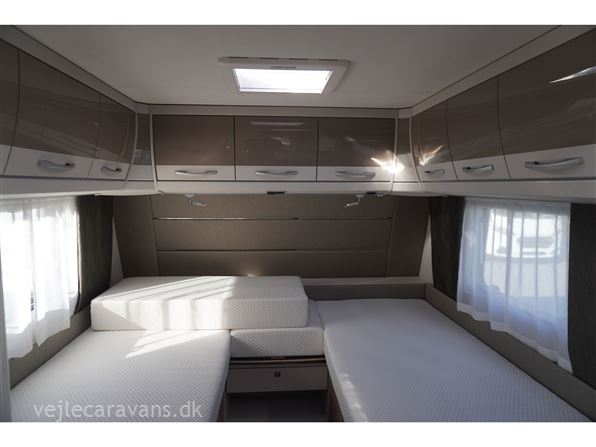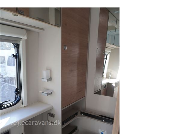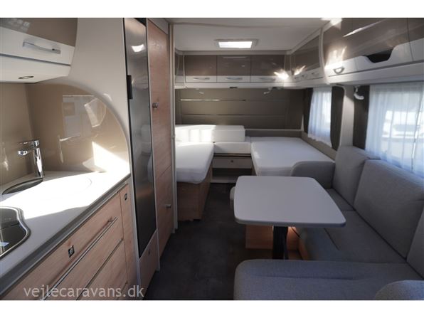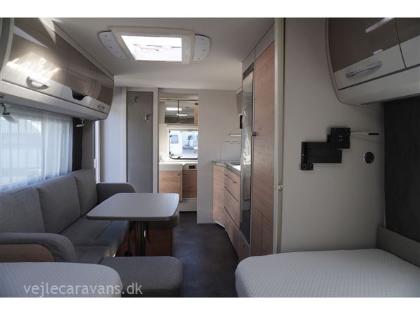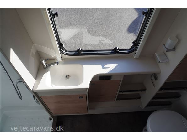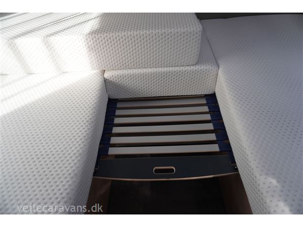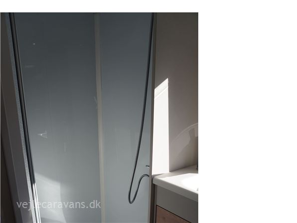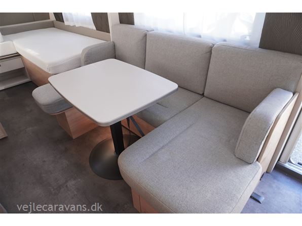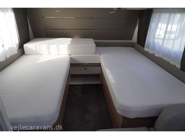 Campingvogn med 2 enkeltsenge i front med mulighed for at lave en dobbeltseng. Rundsiddegruppe midt i vognen. Køkken i venstre side af vognen væk fra fortelt siden med 3 gasblus, brede skuffer, et udtræksskab, samt et køleskab på 142 ltr. Toilet på tværs af bagenden af campingvognen med bruser i højre side og toilet i venstre side. Der er monteret solceller og batteri til egenforsyning og truma duocontrol. Der medfølger ikke nogen fortelt så hør os om mulighederne. Prisen er inkl. leveringsomkostninger og nr. plade.