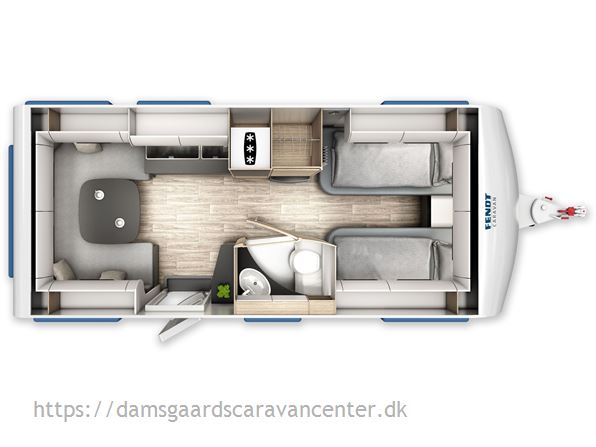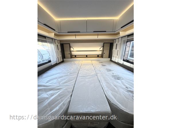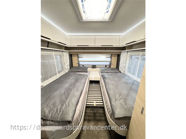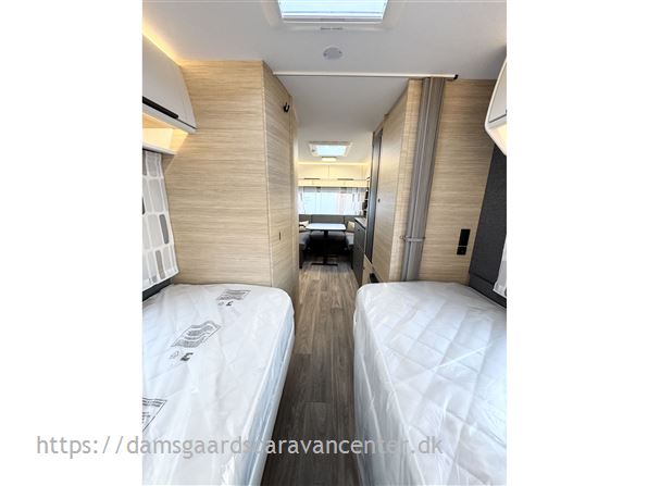 Vognen har gulvtemperering, enkeltsenge med lameludtræk og leveres med dyner, puder og sengetøj.