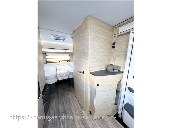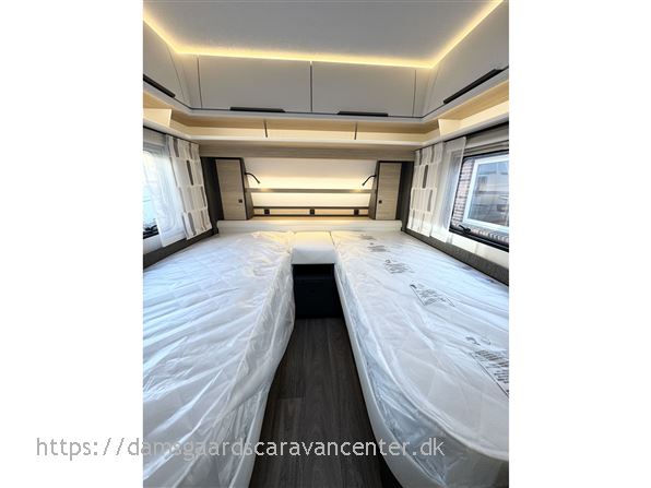 Vognen har gulvtemperering, enkeltsenge med lameludtræk og leveres med dyner, puder og sengetøj.