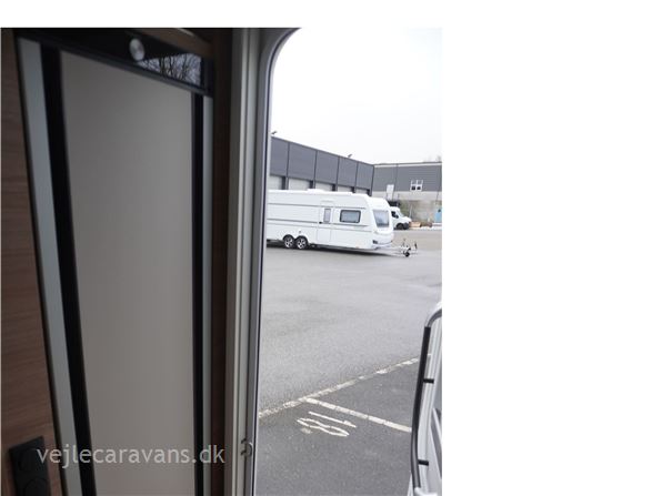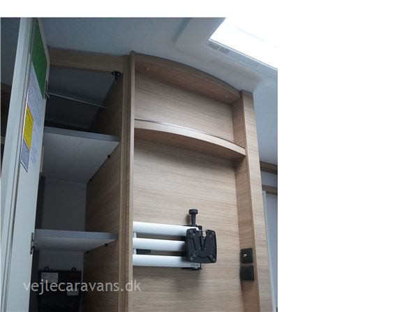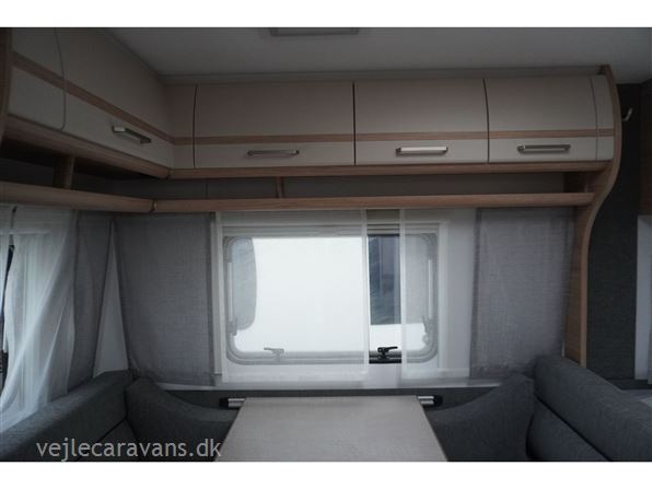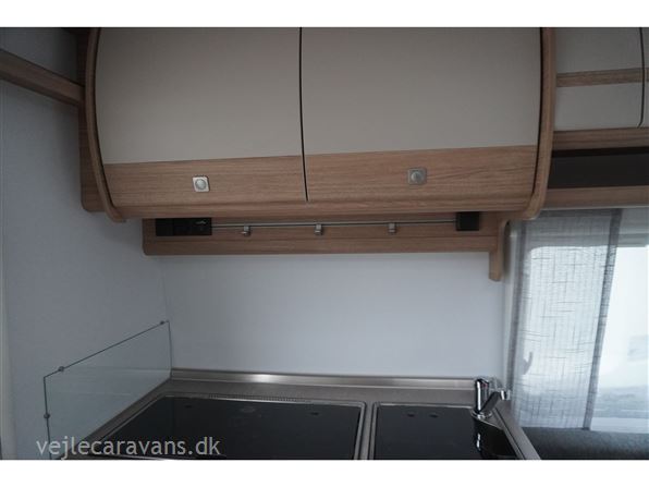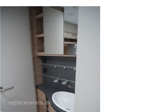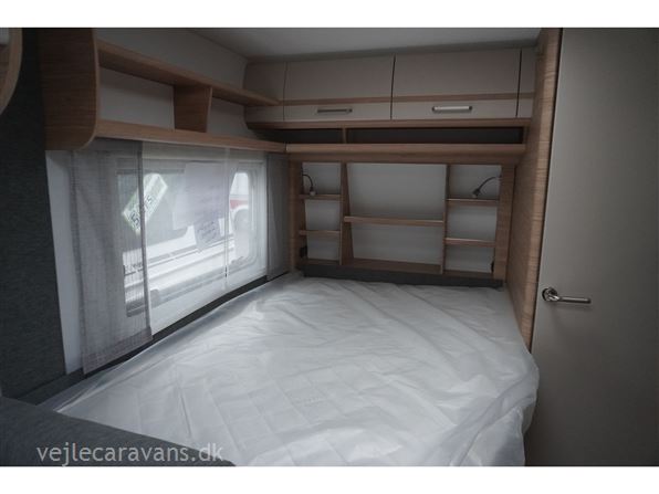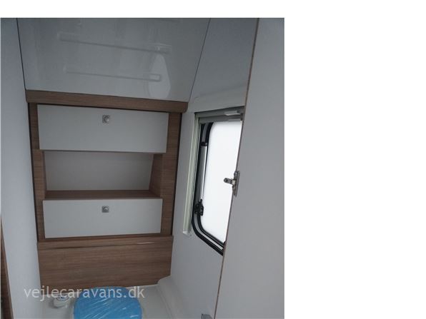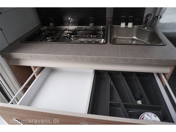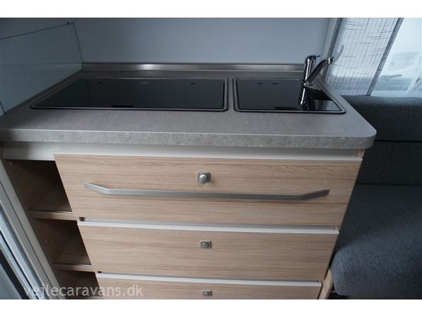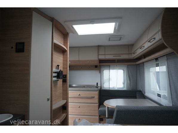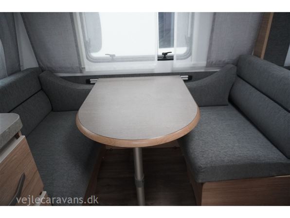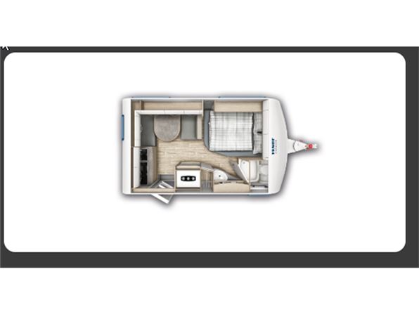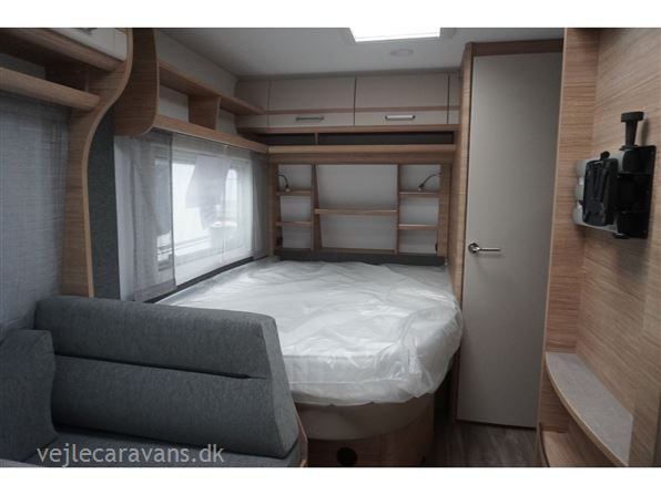 Rejse campingvogn med fransk seng i venstre side foran, og toilet ved siden af i højre side for. Sidesiddegruppe i venstre side bag. Endekøkken lige indenfor døren med 3 gasblus og brede skuffer, og et køleskab på 140 ltr. Vognen er bestilt med følgende ekstra udstyr: 1700 kg. aksel, gulvtemperering, myggedør, lys pakke, TV holder. Prisen er inkl. leveringsomkostninger og nr. plade.
