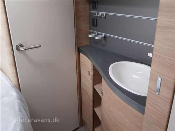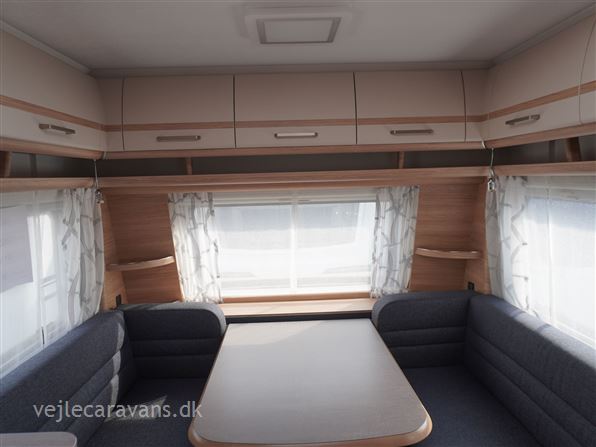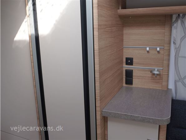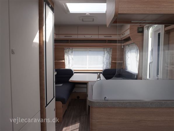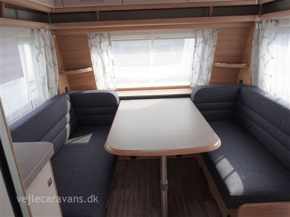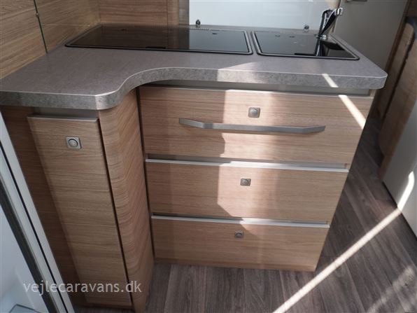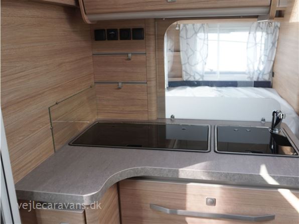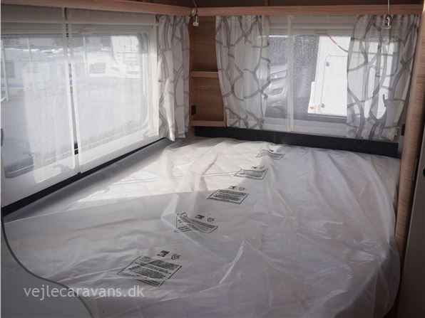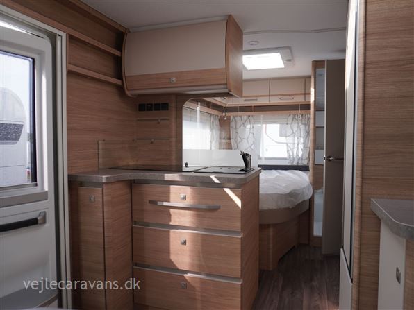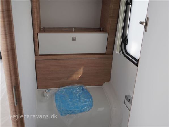 Så kom modellen igen fra Fendt med fransk seng i højre side bag, og toilet i venstre side bag væk fra fortelt siden. Siddegruppe i fronten. Køkken som går ud i vognen lige inden for døren, med 3 gasblus og brede skuffer, samt et udtræksskab. Køleskab på 150 ltr i venstre siden af vognen. Denne vogn er bestilt med følgende ekstra udstyr: 1800 kg. aksel, combi E fyr , myggenetsdør, gulvtemperering, lyspakke, TV holder. Prisen er inkl. leveringsomkostninger og nr. plade.