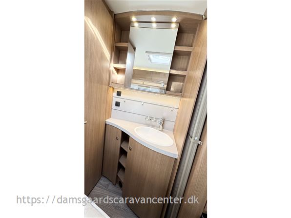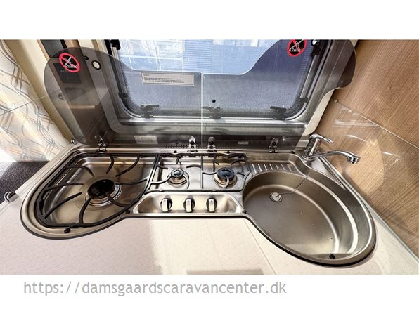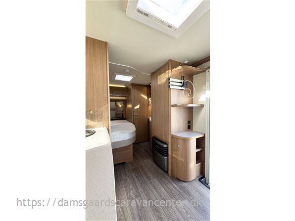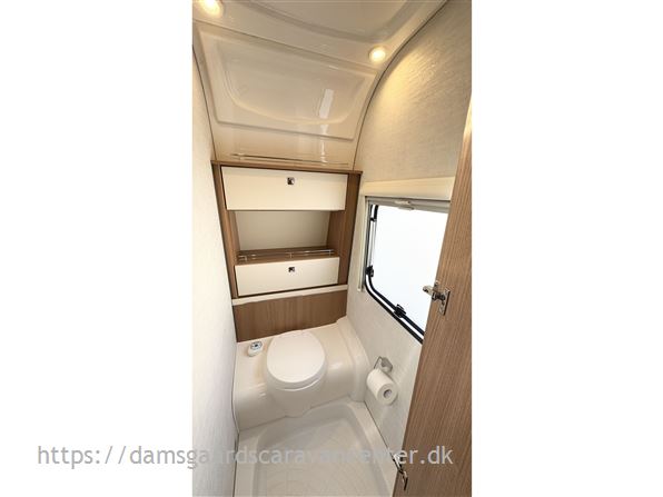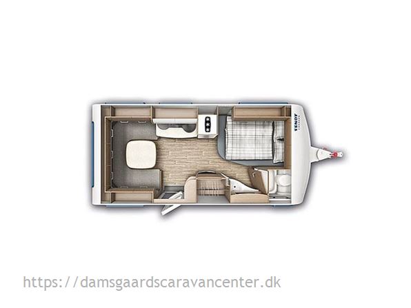 Vognen er indrettet med franskseng og toiletrum i fronten, køkken i midt, modsat side findes lækkert stort skab.