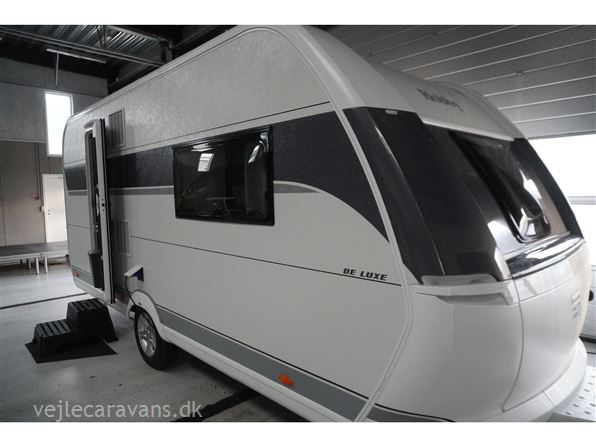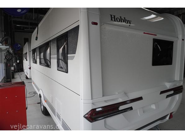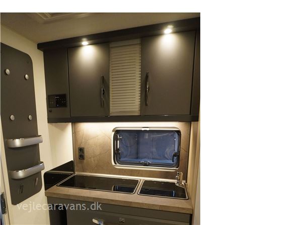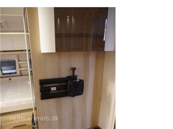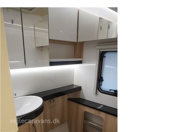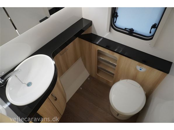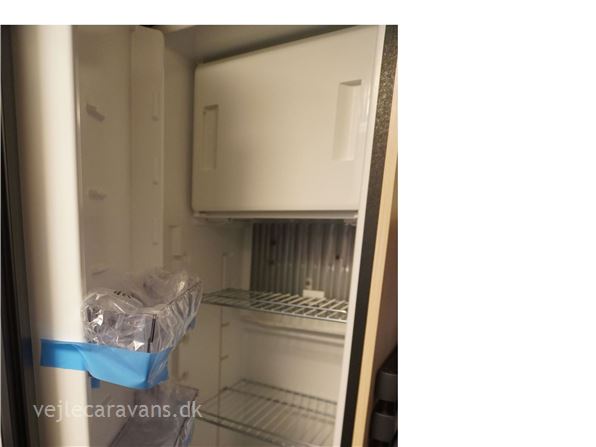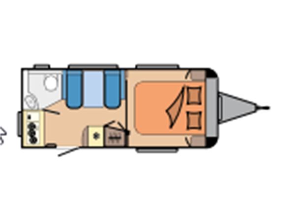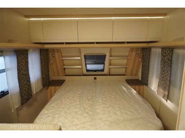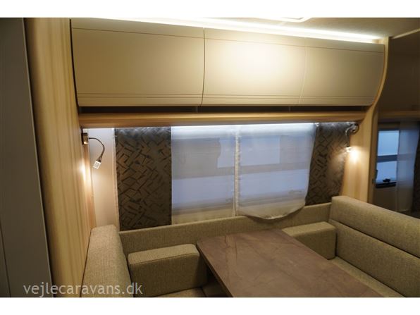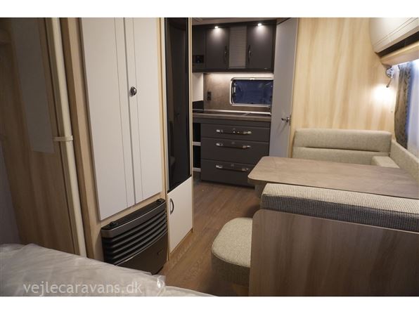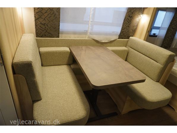 En populær indretning med fritstående dobbeltseng i forenden af campingvognen. Siddegruppe i midten af vognen. Endekøkken indenfor døren med 3 gasblus og brede skuffer, samt et køleskab på 140 ltr. Toilet i venstre side bag væk fra fortelt siden. Vognen er bestilt med følgende ekstra udstyr: 1500 kg. aksel, gulvtemperering.