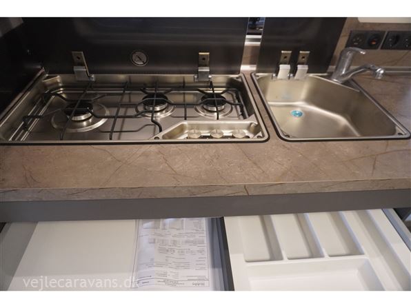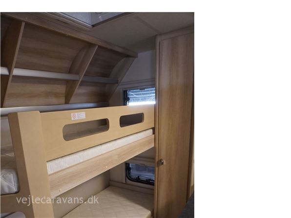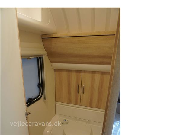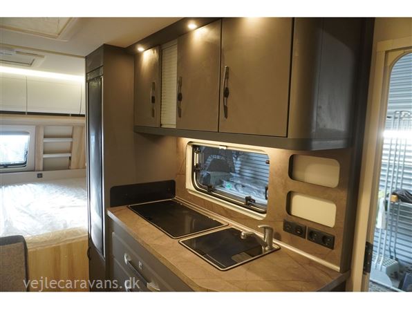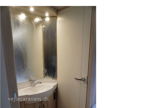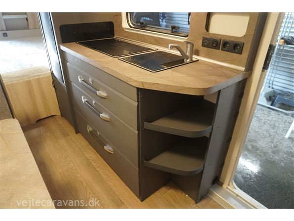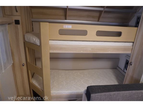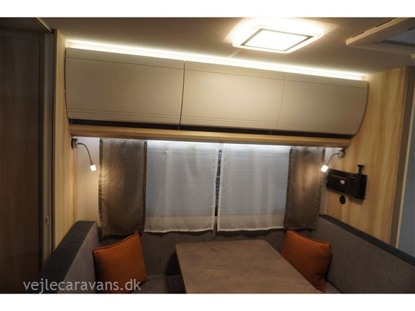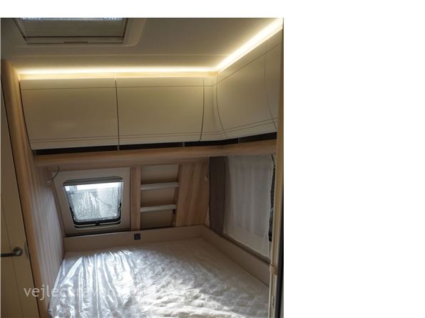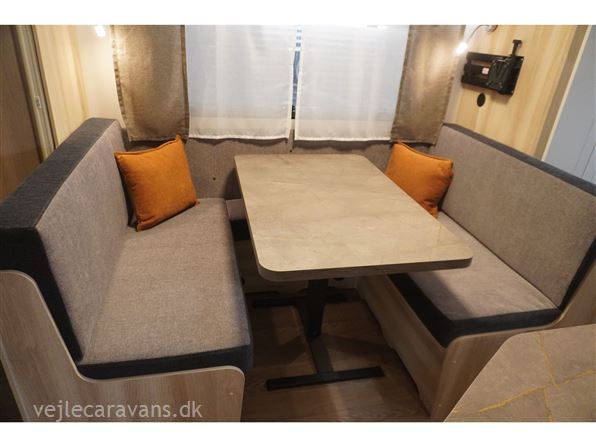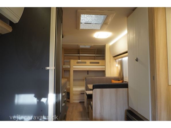Familie campingvogn med 2 køjer på tværs bagerste i campingvognen. Fransk seng i højre side foran. Toilet i venstre side for. Siddegruppe midt i vognen med køkken overfor siddegruppen med 3 gasblus, brede skuffe, og et køleskab på 133 ltr. Den er bestilt med følgende udstyr: 1800 kg. aksel, alufælge, Gulvtemperering, tv holder, ambientebelysning. Prisen er inkl. leveringsomkostninger og nr. plade.