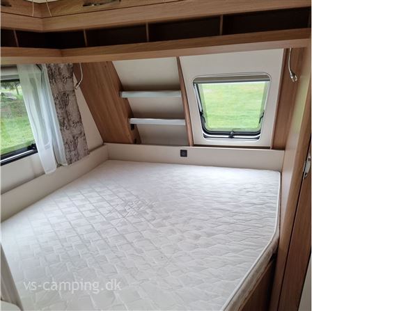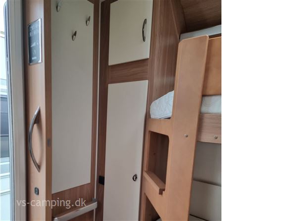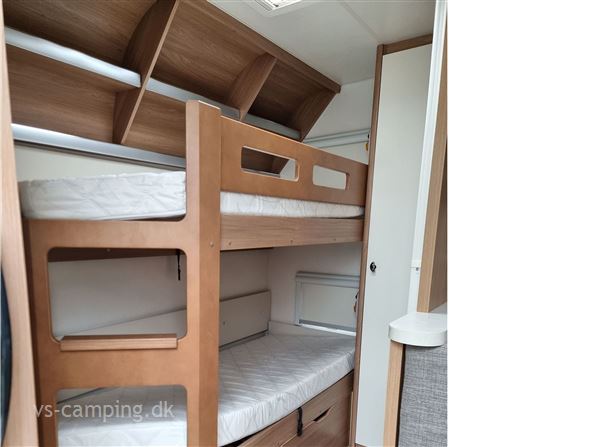 Vognen er indrettet med køjer i bagenden, sidesiddegruppe og stor dobbeltseng.