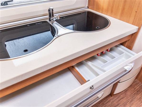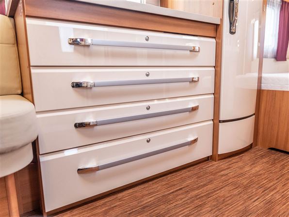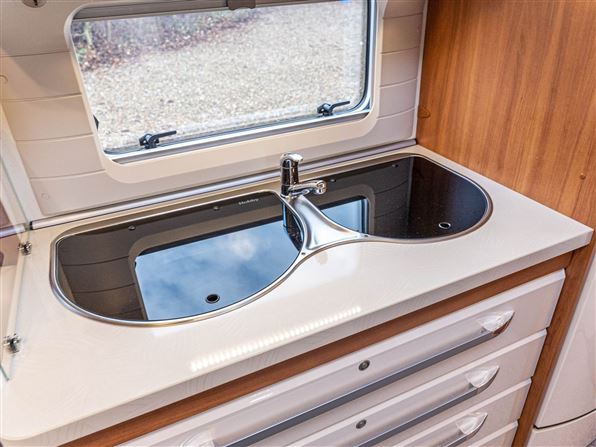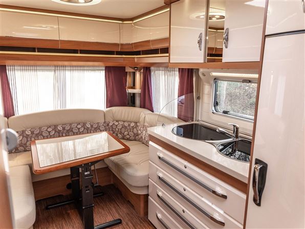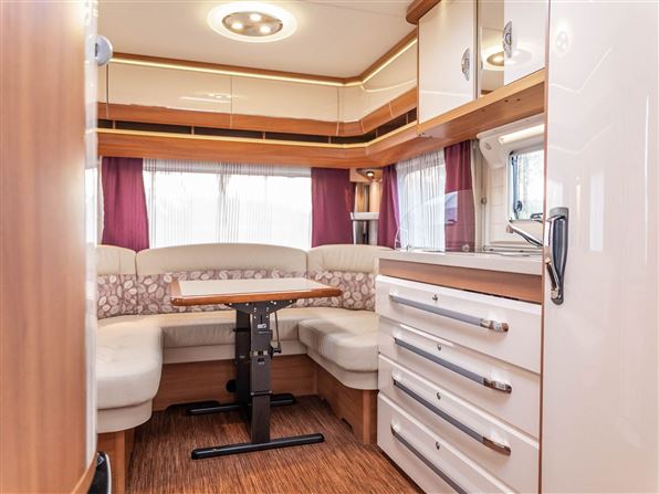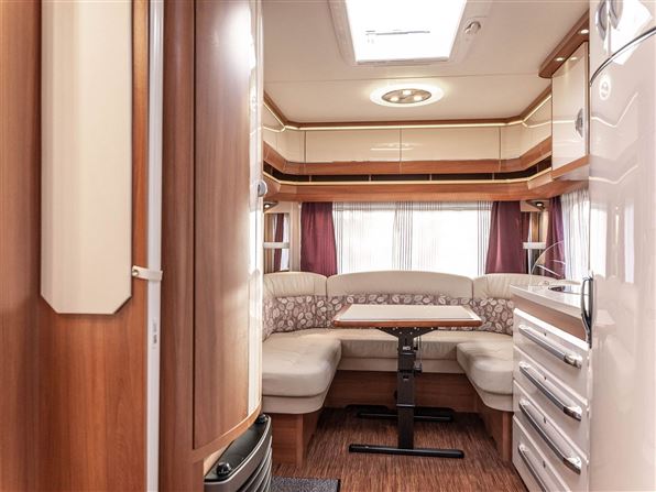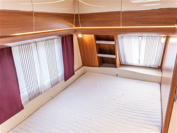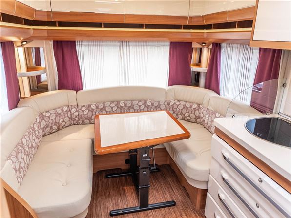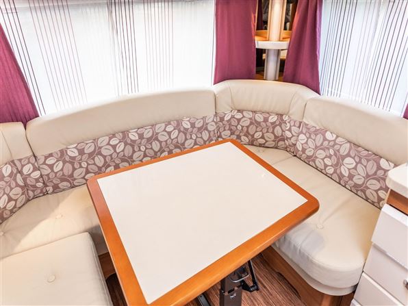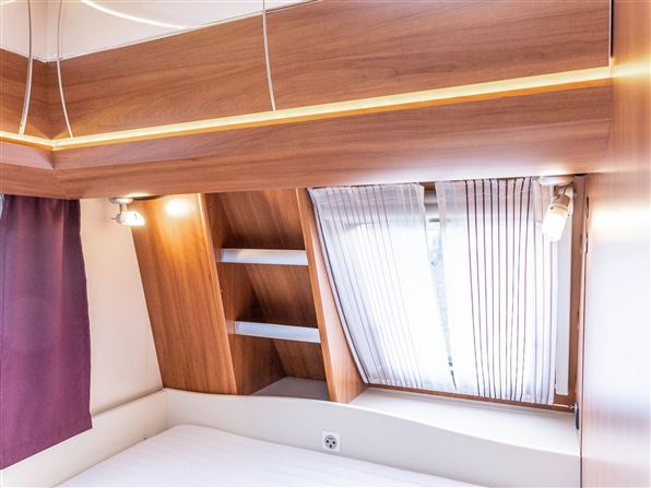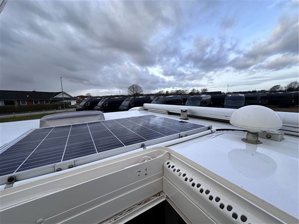 Velholdt og populær campingvogn med dobbeltseng, rundsiddegruppe og moderne køkken. Lys og rummelig indretning, god opbevaring og høj komfort – perfekt til både par og små familier. De 2 solceller på taget, som er forbundet med det installerede batteri gør også fricamping til en mulighed!