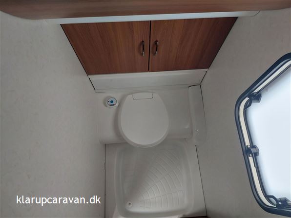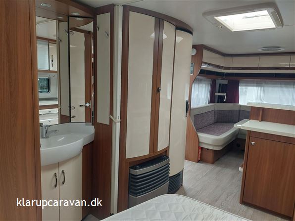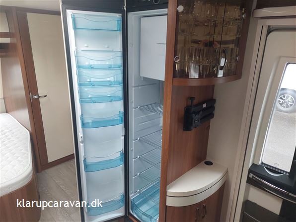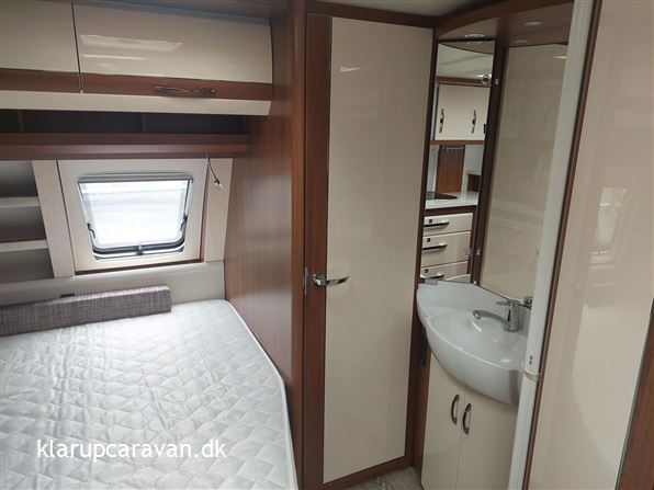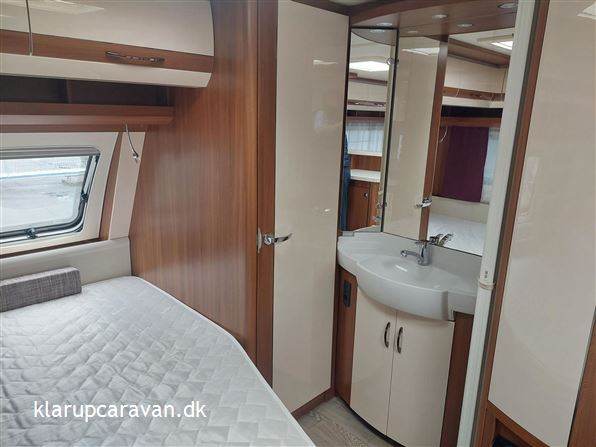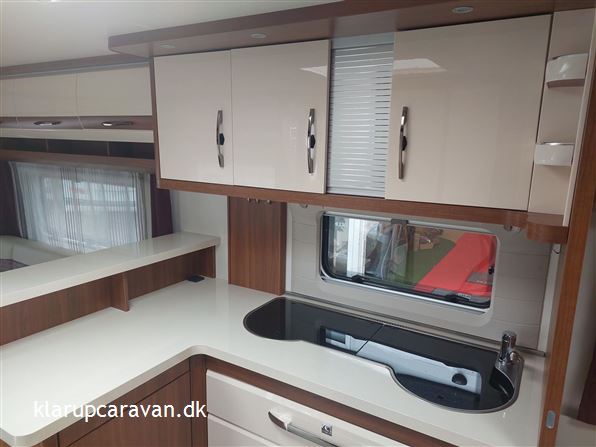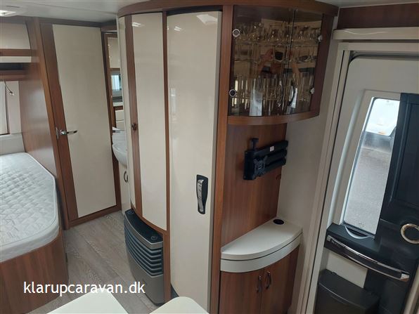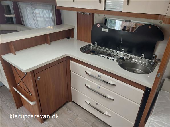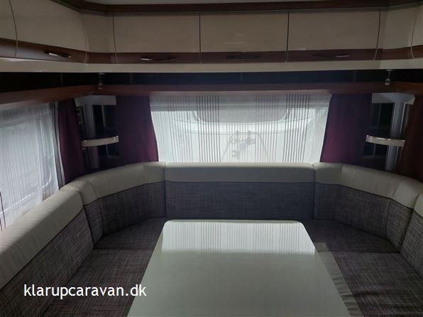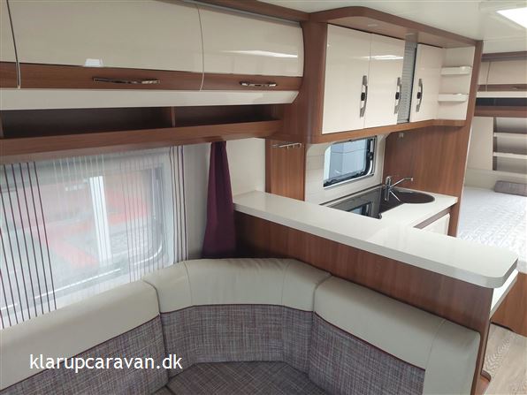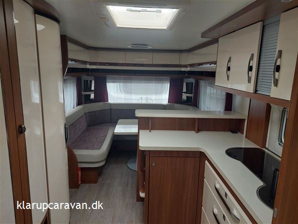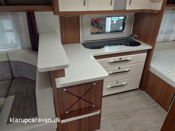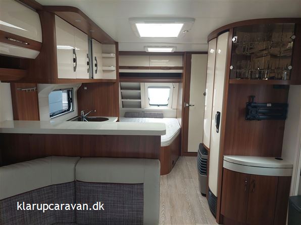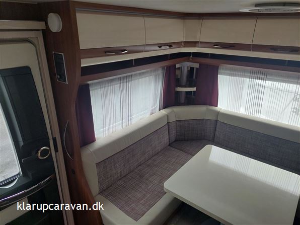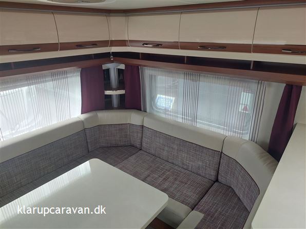 Populær indretning med vinkelkøkken og stor rundsiddegruppe i bagenden af vognen. Fransk seng i fronten med mulighed for at komme ud for enden af sengen. Stort vinkelkøkken med brede skuffer og udtrækshylder i hjørneskabet og et 140 ltr. køleskab. Der medfølger et Isabella Commodore fortelt.