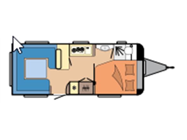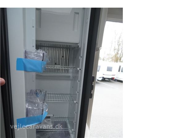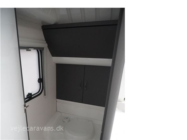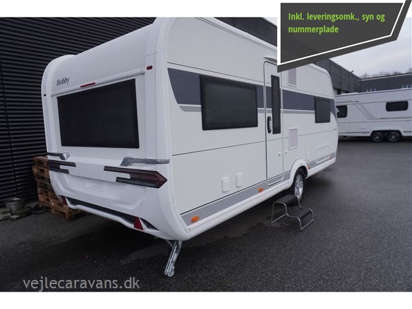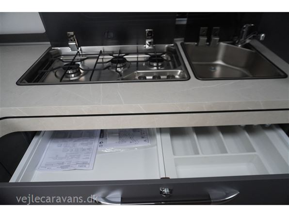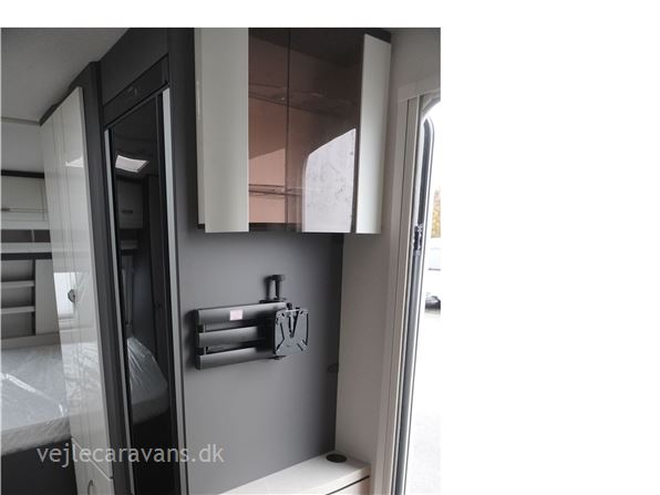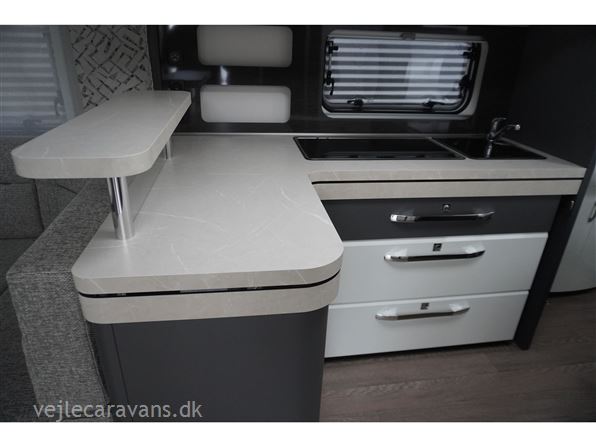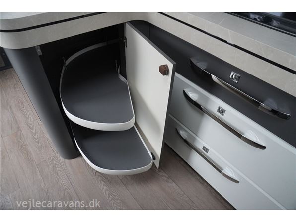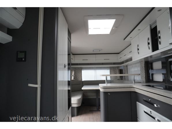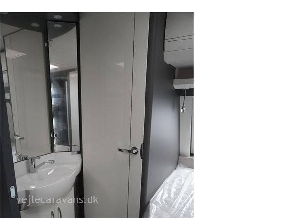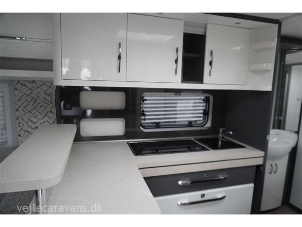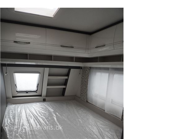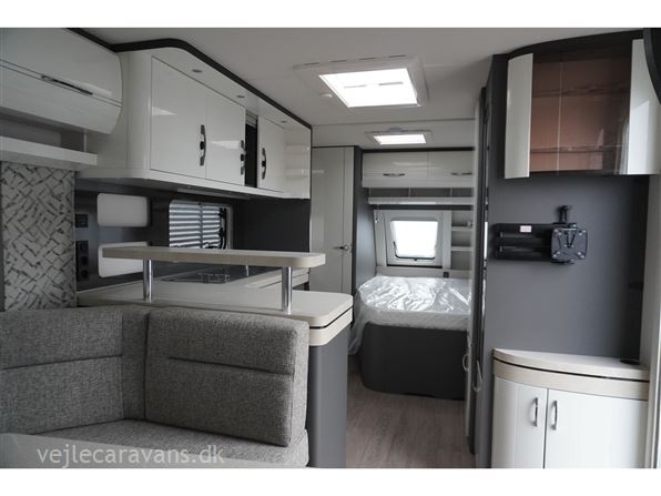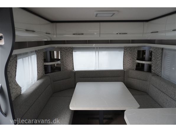 En populær indretning med fransk seng i forenden af vognen. Stor rundsiddegruppe i bagenden af vognen. Kæmpe vinkel køkken med brede skuffer, 3 gasblus, hjørneskab med udtrækshylder, samt et 140 ltr. køleskab. Toilet i venstre side foran. Vognen er bestilt med følgenden ekstra udstyr: 2000 kg. aksel, Alufælge, gulvtemperering, Truma combi 6 E varme, TV holder. Prisen er inkl. leveringsomkostninger og nr. plade.