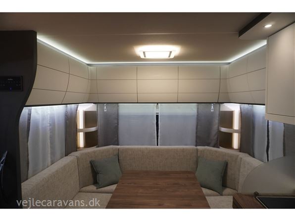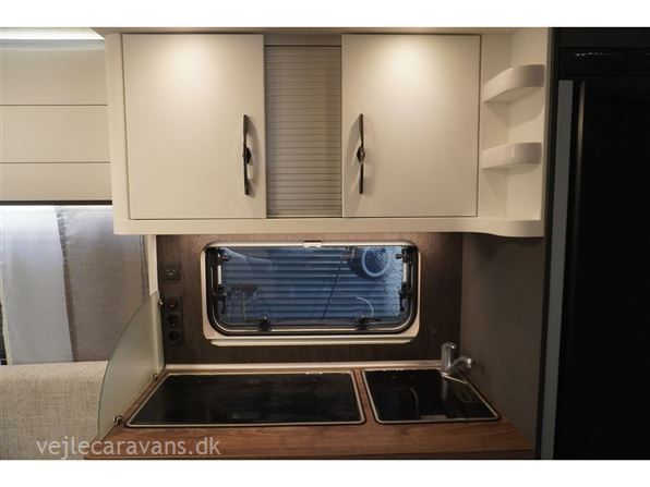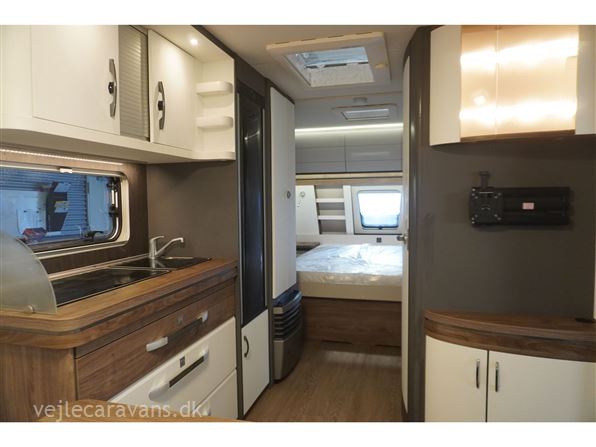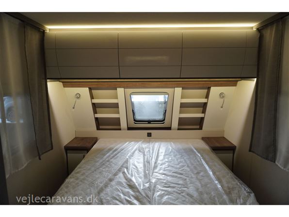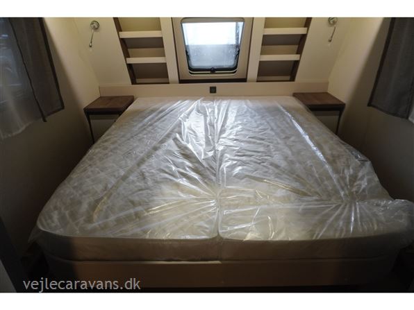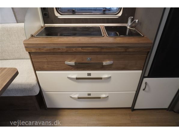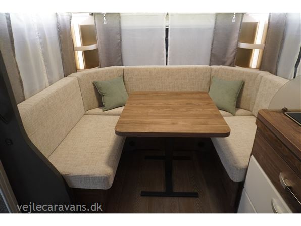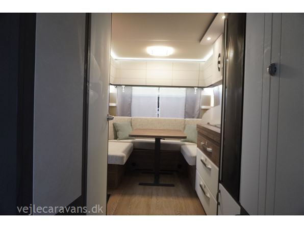 Flot lys og indbydende campingvogn med friststående dobbeltseng i fronten. Rundsiddegruppe i bagenden, køkken midt i vognen med brede skuffer, 3 gasblus, samt et køleskab på 139 ltr. Vognen fremtræder i flot design og en flot farve sammen sætning mellem låger og hynder. Vognen er bestilt med følgende ekstra udstyr: 1800 kg. aksel, alufælge, gulvtemperering, tv holder. Prisen er inkl. leveringsomkostninger og nr. plade.