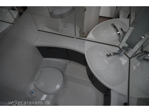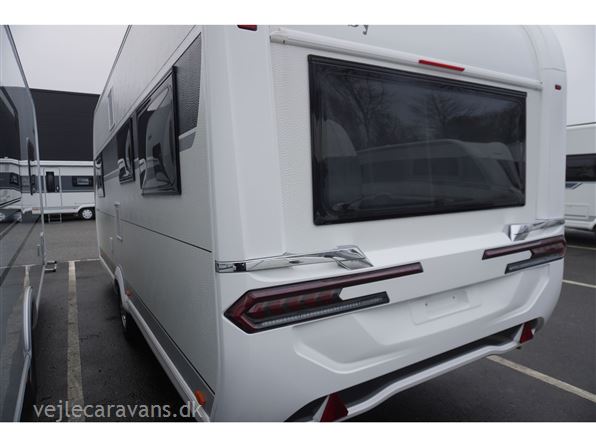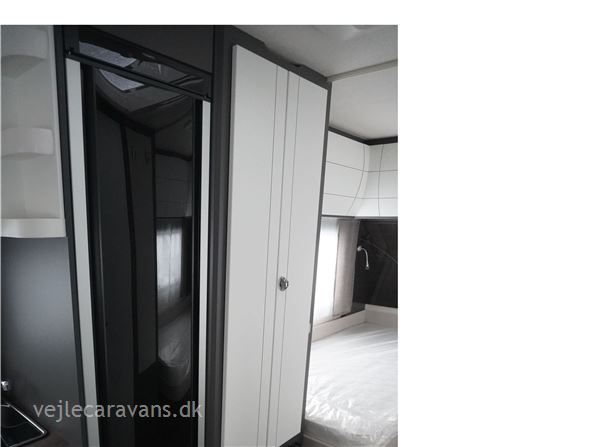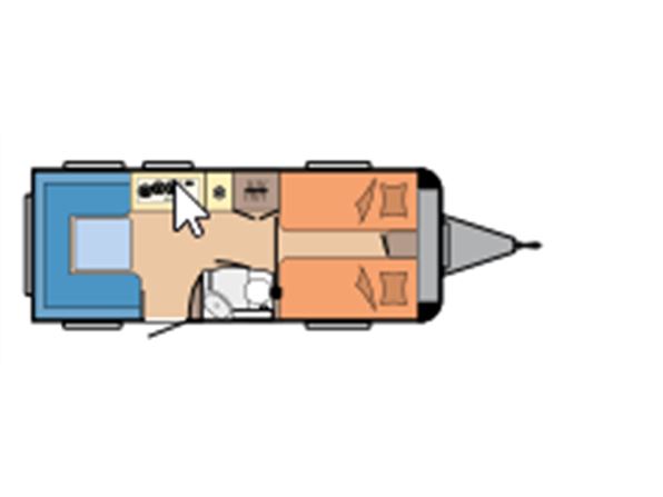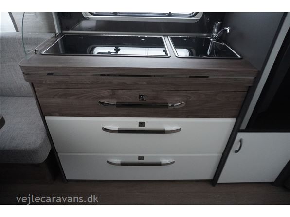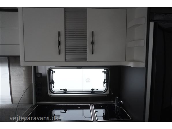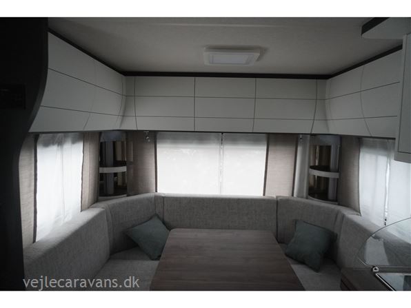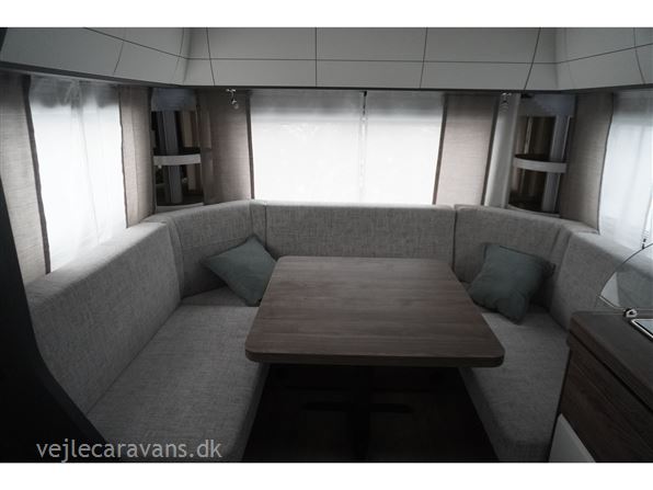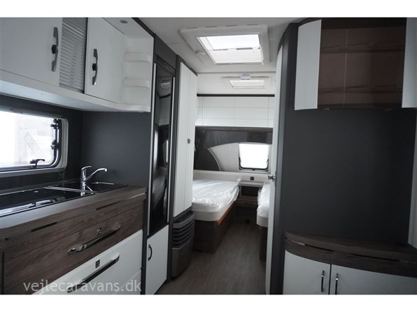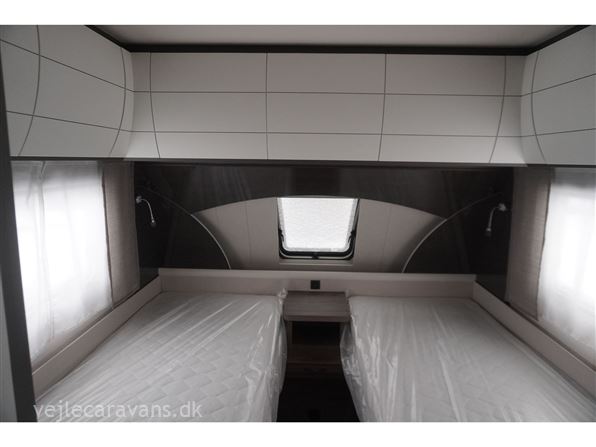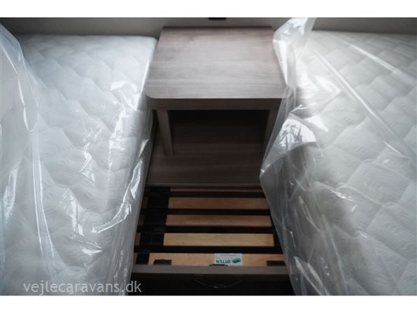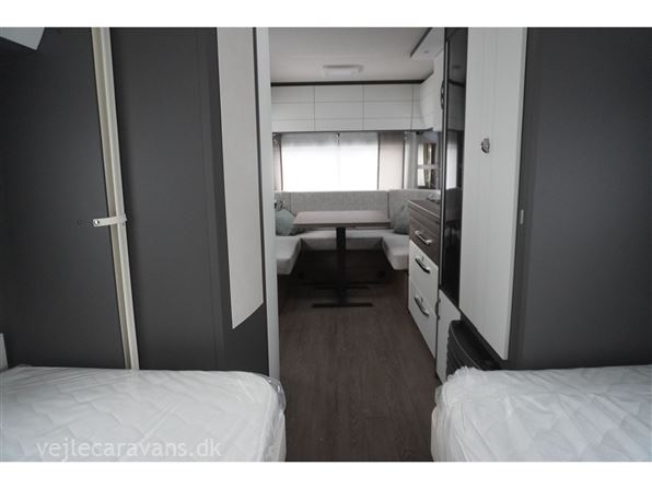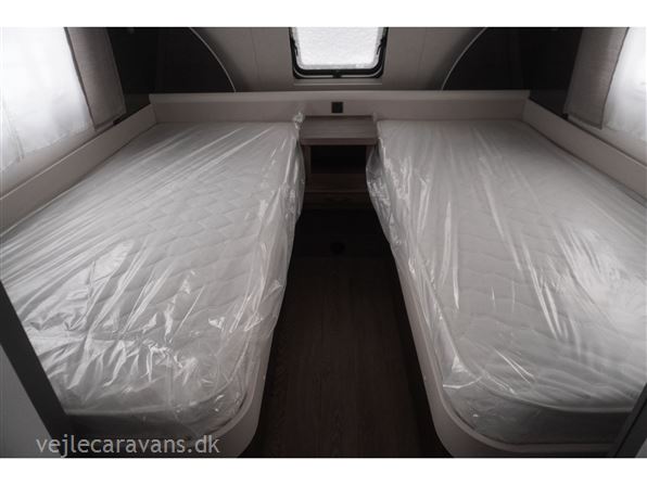 En populær indretning med 2 enkeltsenge med mulighed for at lave en dobbeltseng i forenden af campingvognen. Rundsiddegruppe i bagenden af vognen. Køkken midt i vognen med 3 gasblus og brede skuffer, samt et køleskab på 140 ltr. Toiletrum med skabsplads. Vogne er bestilt med følgende udstyr: 1800 kg aksel, sengeudvidelse, gulvtemperering. Prisen er inkl. leveringomkostninger og nr. plade.
