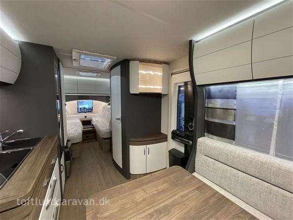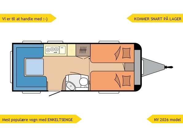 Denne indretning med 2 super gode enkeltsenge, stor rundsiddegruppe og med indvendige mål lige over 5 meter er nok en af de mest solgte på markedet! Kom og oplev denne hos os. Husk vi er til at handle med :-) Lad os gi' et godt tilbud på finansieringen, både med eller helt uden udbetaling.