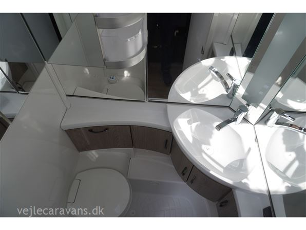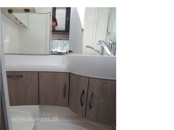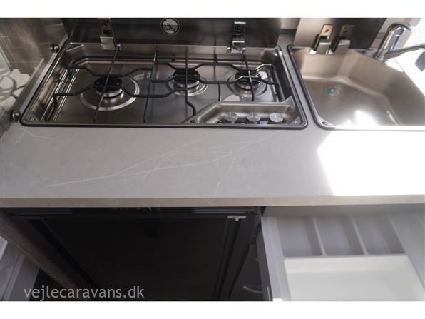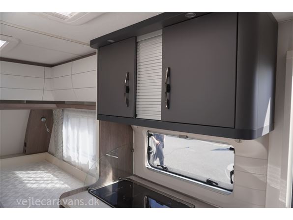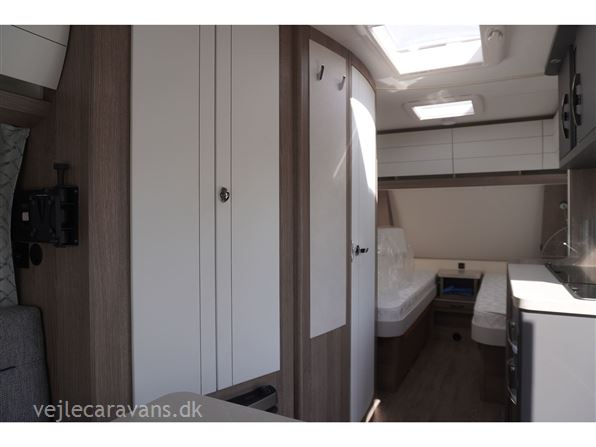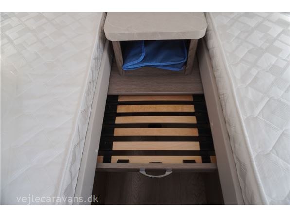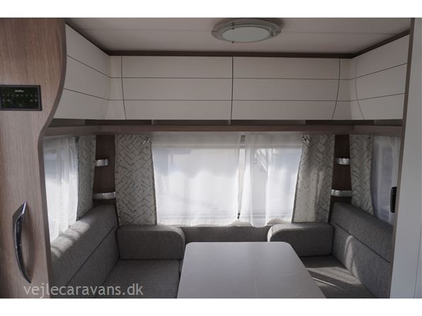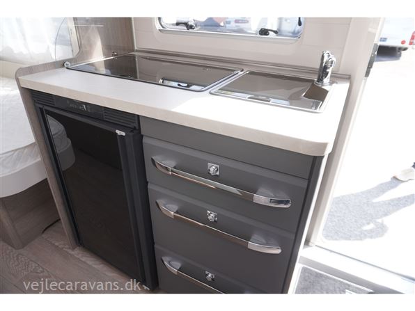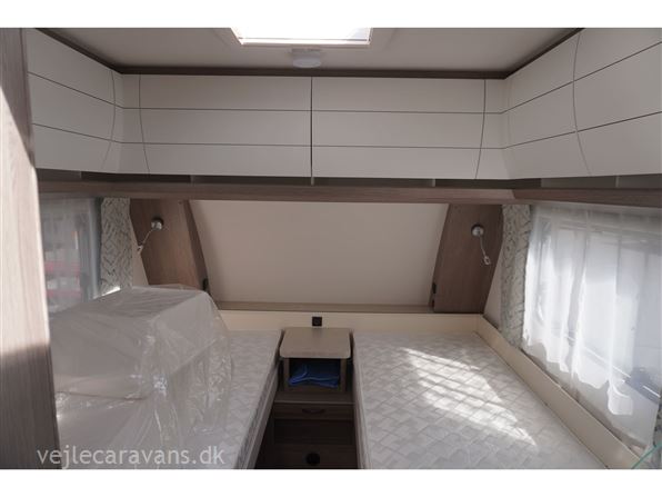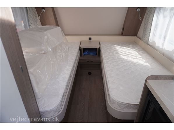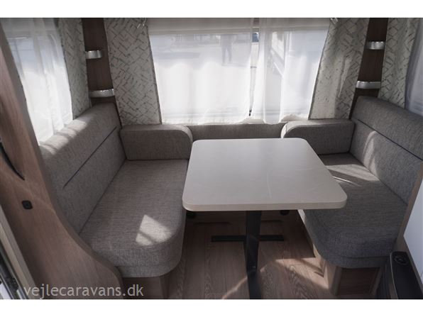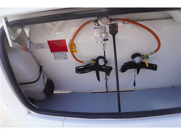 En næsten ubrugt campingvogn med 2 enkeltsenge i front med mulighed for at lave en dobbeltseng. Siddegruppe bagerste i vognen. Køkken med 3 gasblus, skuffer, samt et kompressor køleskab på 98 ltr. Toilet i venstre side væk fra fortelt siden. Der er monteret duocontrol og ultraheat. Prisen er inkl. leveringsomkostninger og nr. plade.