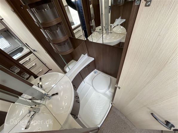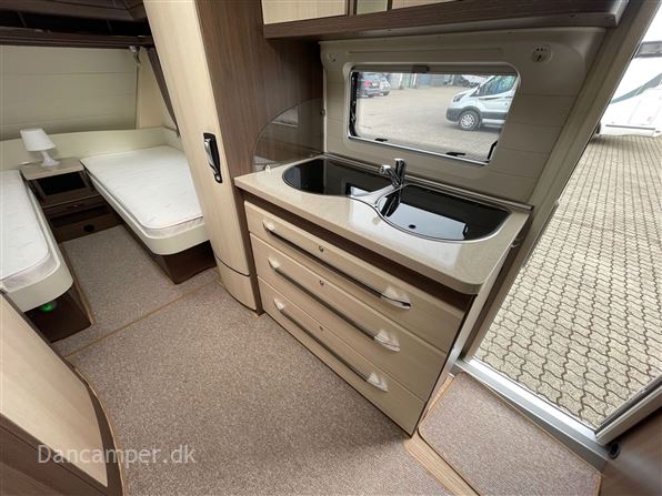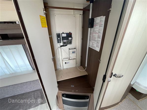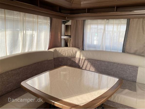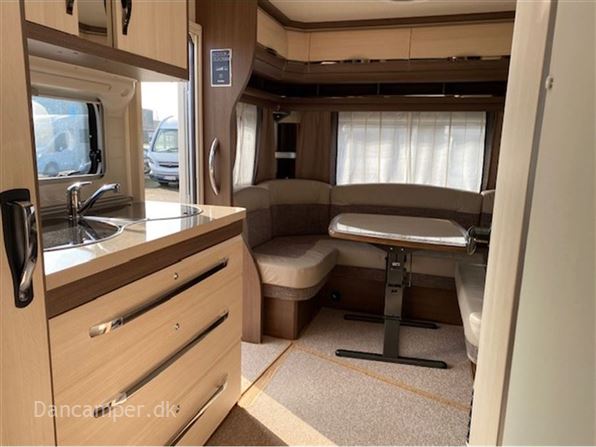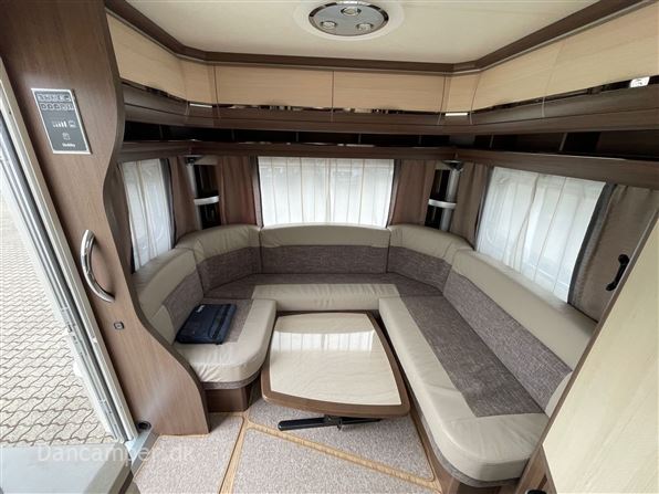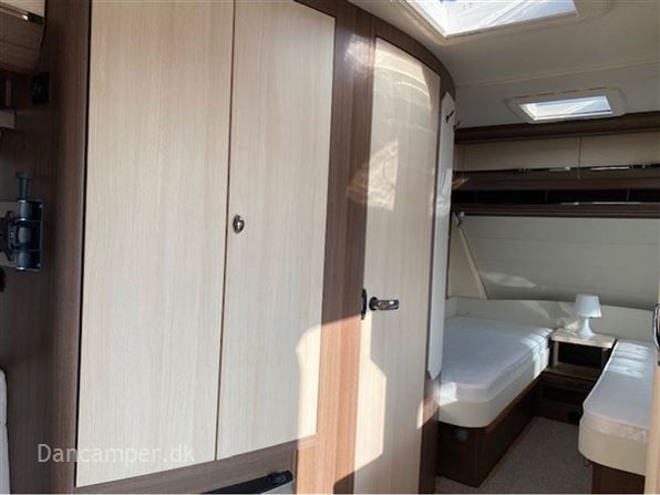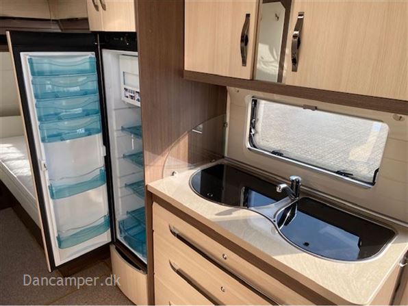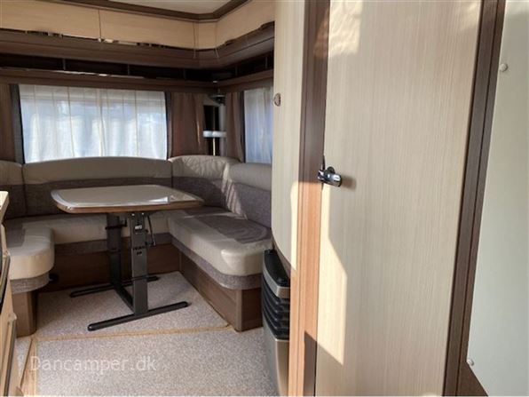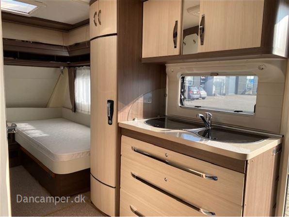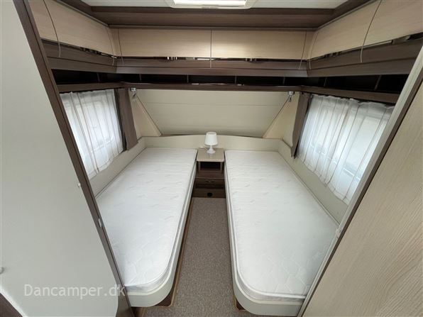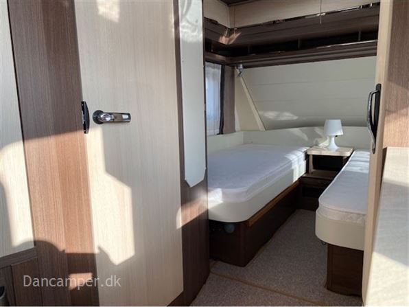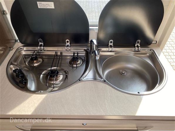 Campingvogn med 2 enkeltsenge med mulighed for at lave en dobbeltseng i forenden af campingvognen. Rundsiddegruppe bagerste i vognen. Køkken i venstre side af vognen med 3 gasblus, brede skuffer, samt et køleskab på 150 ltr. Toilet i højre side af vognen med skabsplads. Der er monteret mover, antenne, Tv holder. Der medfølger et Isabella Ventura Trinus 400 lufttelt. Der tages forbehold for tastefejl.