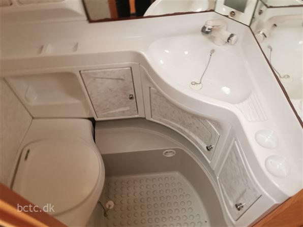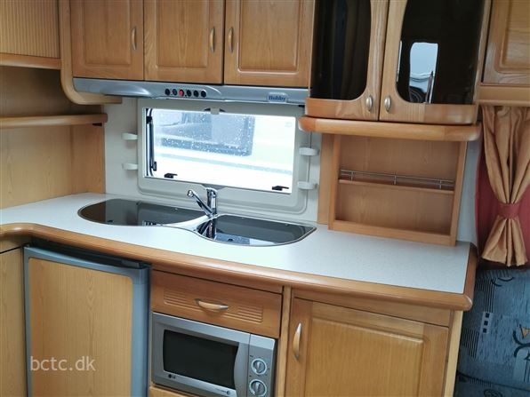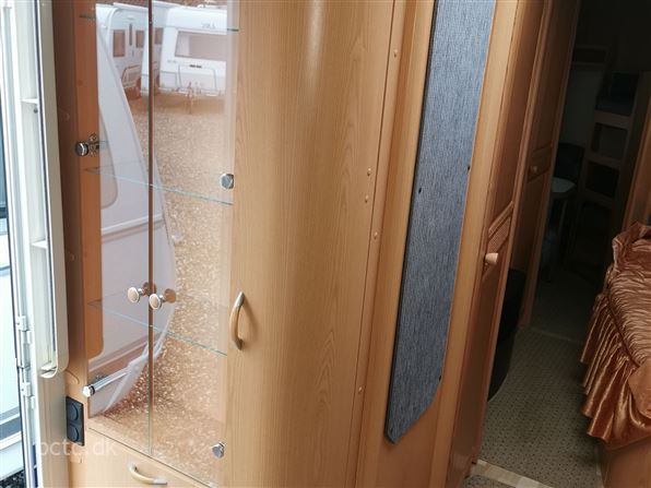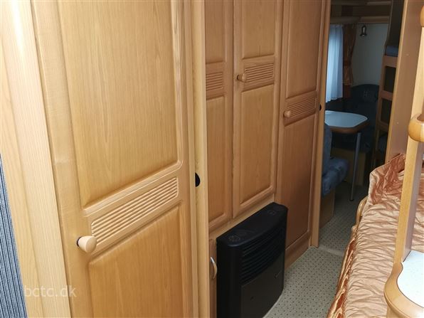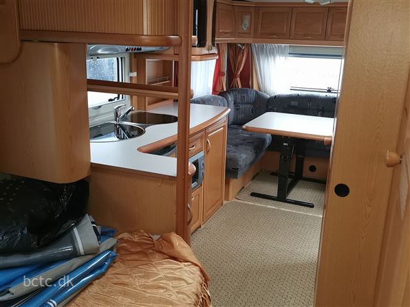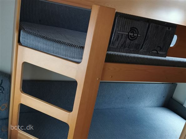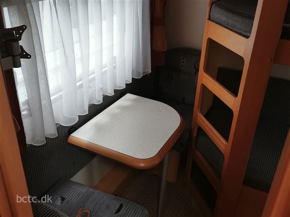 Dejlig familievogn med stor rundsiddegruppe i front, kæmpe køkken og ekstra mange højskabe, dejlig dobbeltseng. Børneafdeling med køjesenge, lille siddegruppe samt højskab.