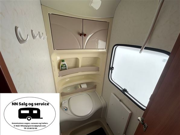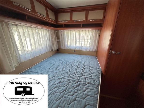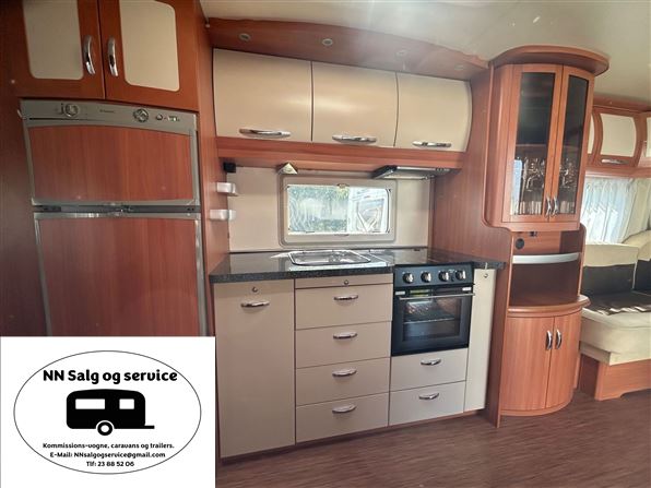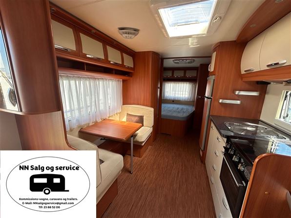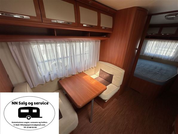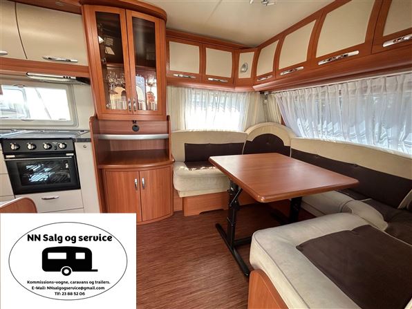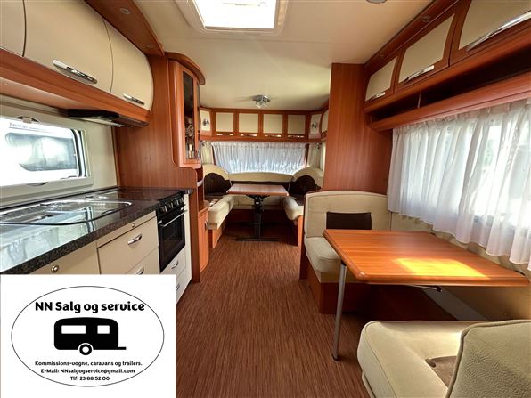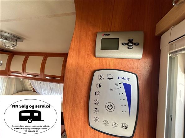 Mega lækker og sjælden vogn fra Hobby lavet i begrænset udgave, spækket med udstyr.... Forrest en en fantastisk stor lækker rundsiddegruppe med plads til at slænge sig, midt i vogne en lille siddegruppe, overfor et veludstyret køkken med stort køleskab med separat fryser samt et lækkert komfur med 3 kogeblus og gasbageovn, bagerst en fransk dobbeltseng samt toiletrum, masser af skabsplads i hele vognen.