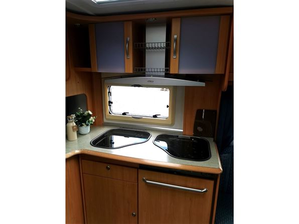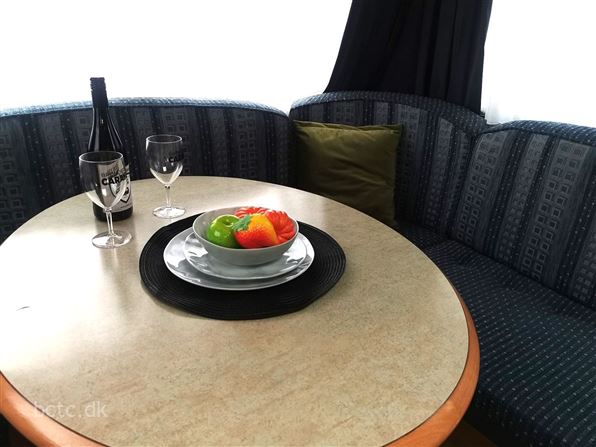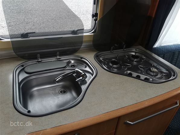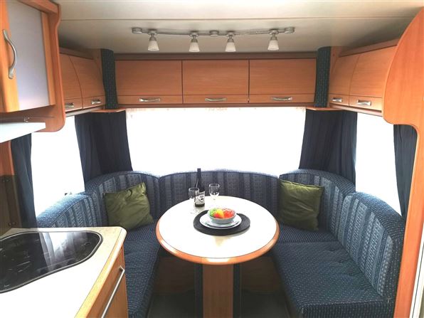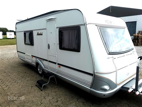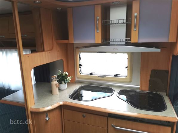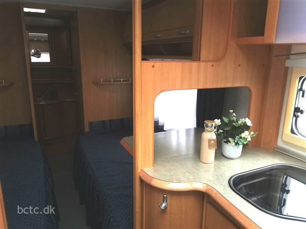 Denne vogn er med vandbåren gulvvarme (Truma) samt emhætte, myggenetdør og stpr tagluge samt sengetæpper.