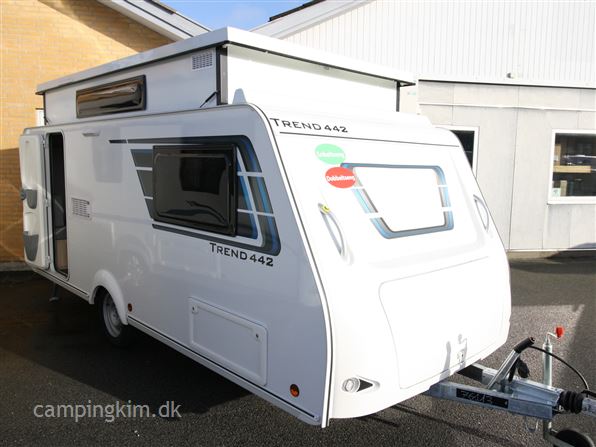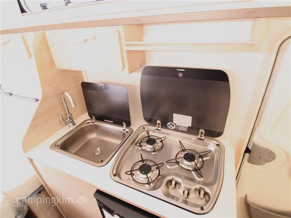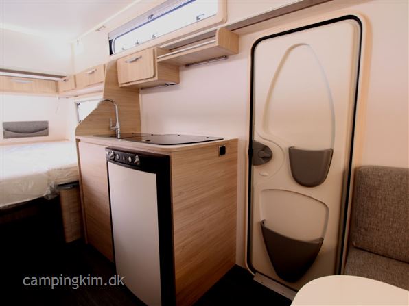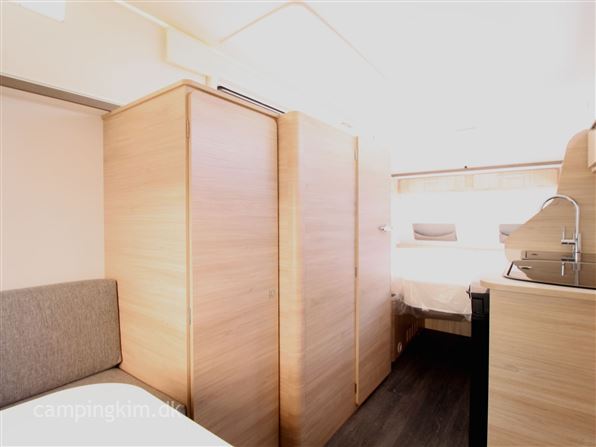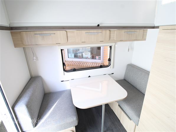 SE VIDEO AF VOGNEN PÅ VORES HJEMMESIDE, Nypris i dag 215000 kr. lille let løftetagsvogn som kan bruges både som enkelt og dobbeltsengsvogn, GRP sider og tag med hagl, XPS isolering, siddegruppe, køkken med 3 kogeblus, vask og køleskab med fryser, Truma Vario heat, kasettegardiner med mørklægning og insektnet, toiletrum med toilet, vask og brusebund, USB. udtag teltlampe, serviceluger og stabilisator træk m.m.