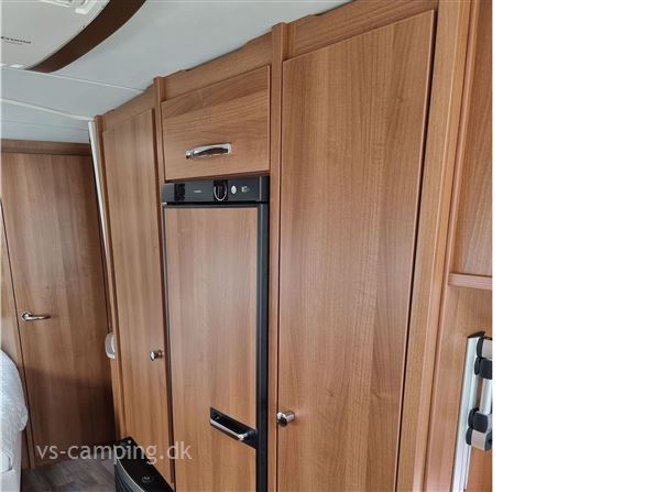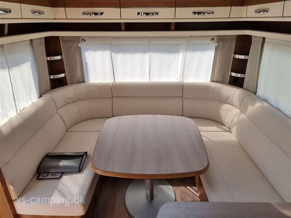 Vognen er indrettet med en stor rundsiddegruppe, stort køkken og fransk seng.